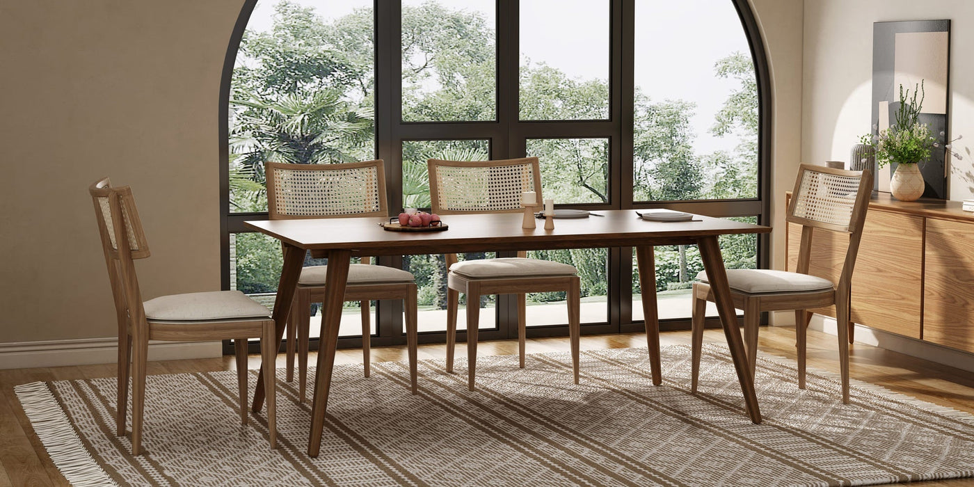 Every piece in this collection starts with quality materials: sturdy wood and walnut wood frames, smooth glass surfaces, and carefully woven cane details. These elements are combined with precise joinery and well-finished edges to ensure each Dining Chair and Dining Table not only looks refined up close, but also stands up to regular use in a busy household.