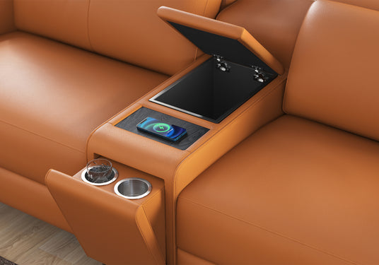 This console-equipped power recliner from the Valencia Elodie Collection combines luxury and functionality, featuring integrated cup holders, built-in wireless charging, and convenient storage compartments to keep remotes, devices, and essentials organized.