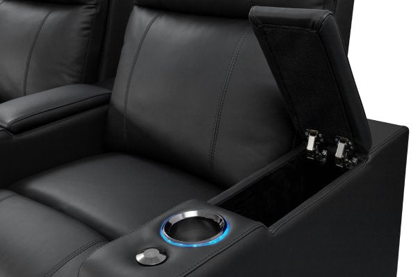 Customize your Piacenza seat with the accessory dock—add swivel tables, wine glass holders, device mounts, LED lights, snack bowls, and more for the ultimate home theater experience.