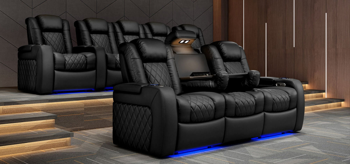 Among our most celebrated designs, the Tuscany Collection stands out as the ultimate choice for true home cinema enthusiasts. Each piece in this premium line is crafted to the highest quality standards, ensuring years of luxurious enjoyment. These theater recliners blend style, function, and innovation, featuring premium Italian Nappa top grain leather upholstery, reinforced construction, and ergonomic comfort that far surpasses standard living room furniture.