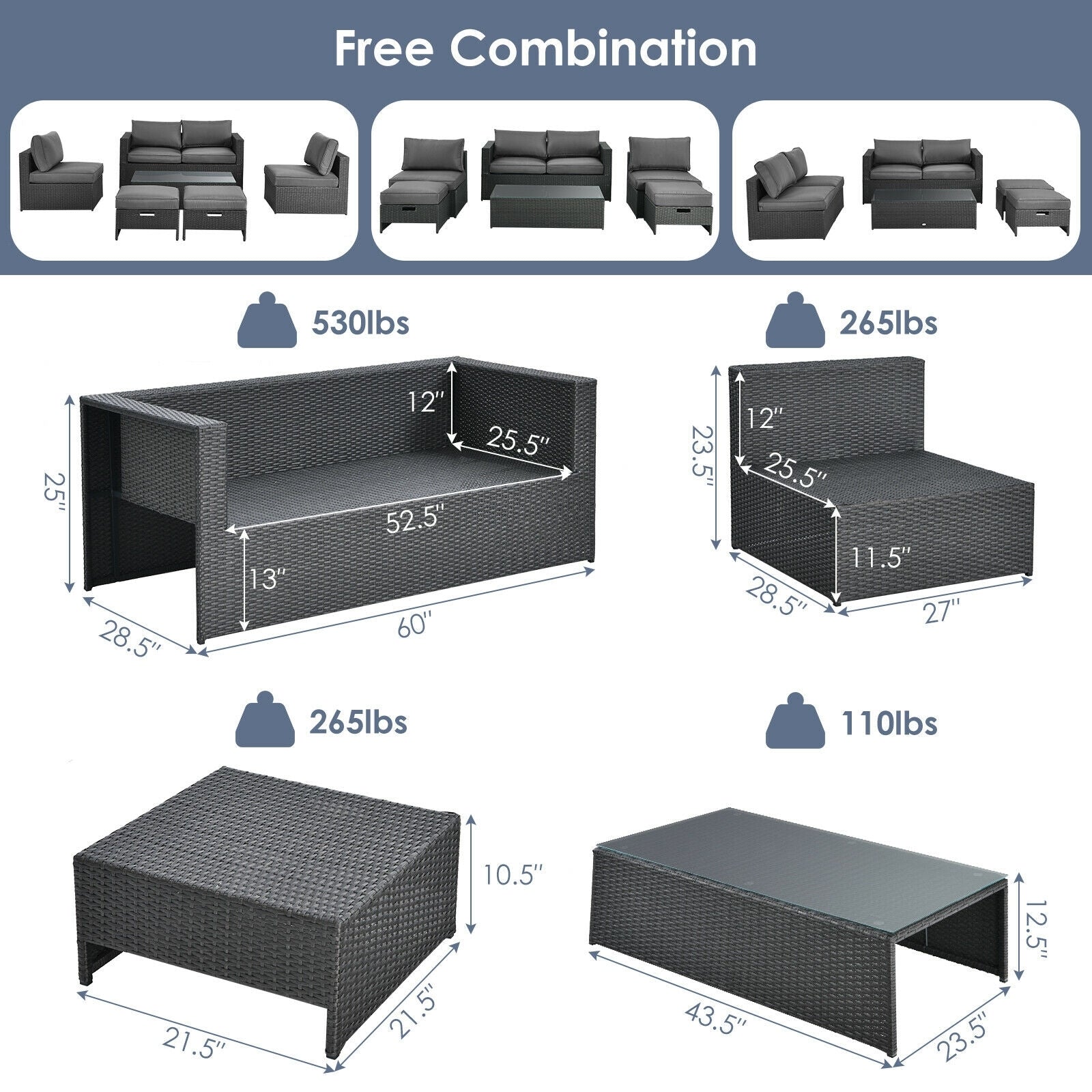 ● Fully Assembled and Free Combination: This patio set has been fully assembled. The patio set includes: 1 x loveseat (60" x 28.5" x 73"), 2 x armless sofas (27" x 28.5" x 23.5"), 2 x ottomans (21.5" x 21.5" x 10.5") and 1 x coffee table (43.5" x 23.5" x 12.5"). There is no limit to combination and you can use each piece separately.