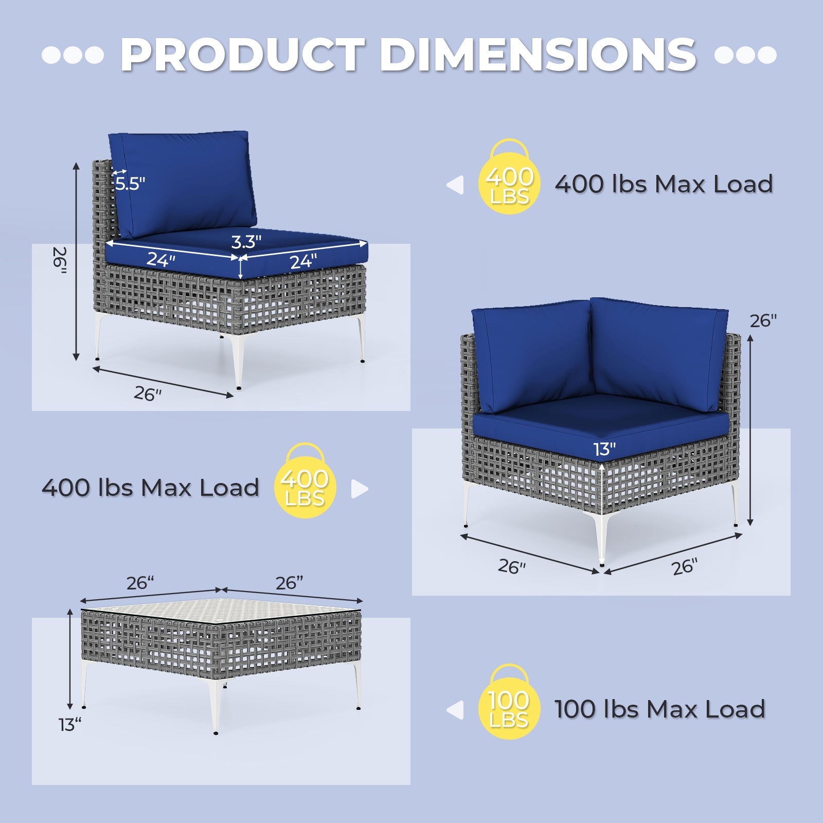● Free Combination: Flexibly arrange this 7-piece set in various configurations to fit outdoor spaces of different sizes, making it an excellent choice for backyard, garden and so on. Dimension of armless sofa: 26" x 24" x 26" (L x W x H). Dimension of corner sofa: 26" x 26" x 26" (L x W x H). Dimension of coffee table: 26" x 26" x 13" (L x W x H).