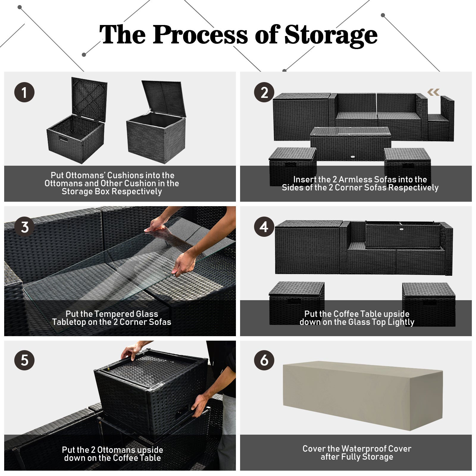 ● 8-piece Modular Set: In order to rearrange your outdoor space based on your preference and available place, this 8-piece outdoor patio furniture set with 1 tempered glass coffee table, 1 storage box, 2 ottomans, 2 armless sofas and 2 corner sofas allows you to combine them into different layouts for great flexibility.