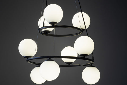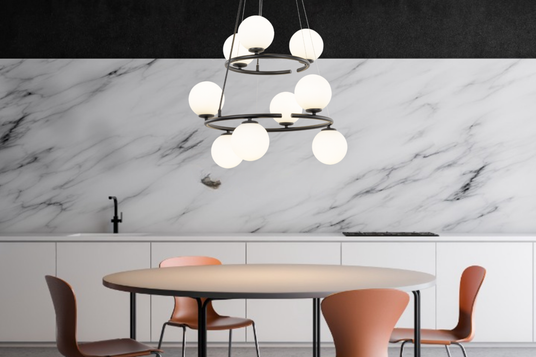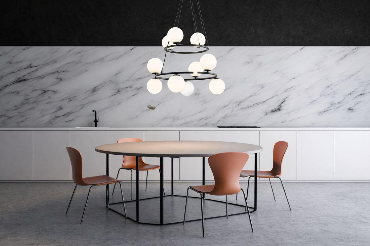 - Sculptural Scandinavian design creates a refined focal point with elegant spherical forms that enhance modern kitchen island and dining room interiors.