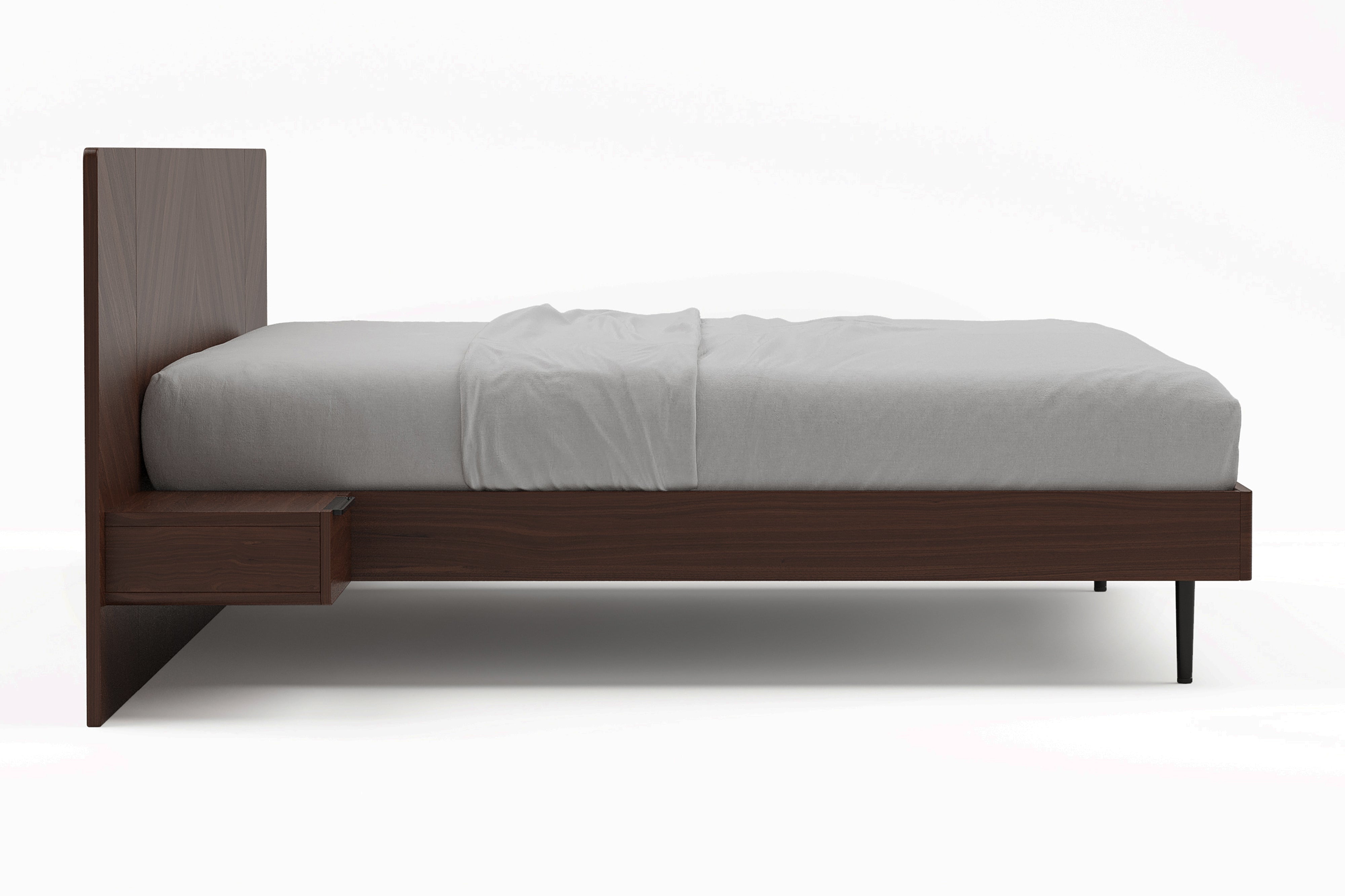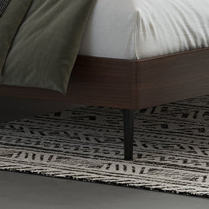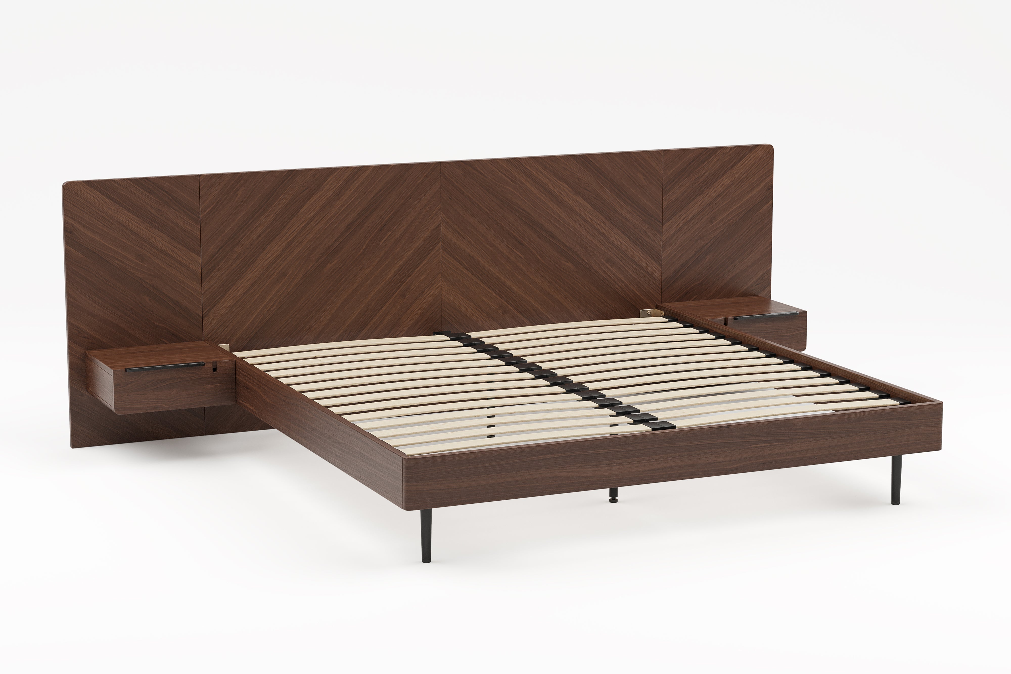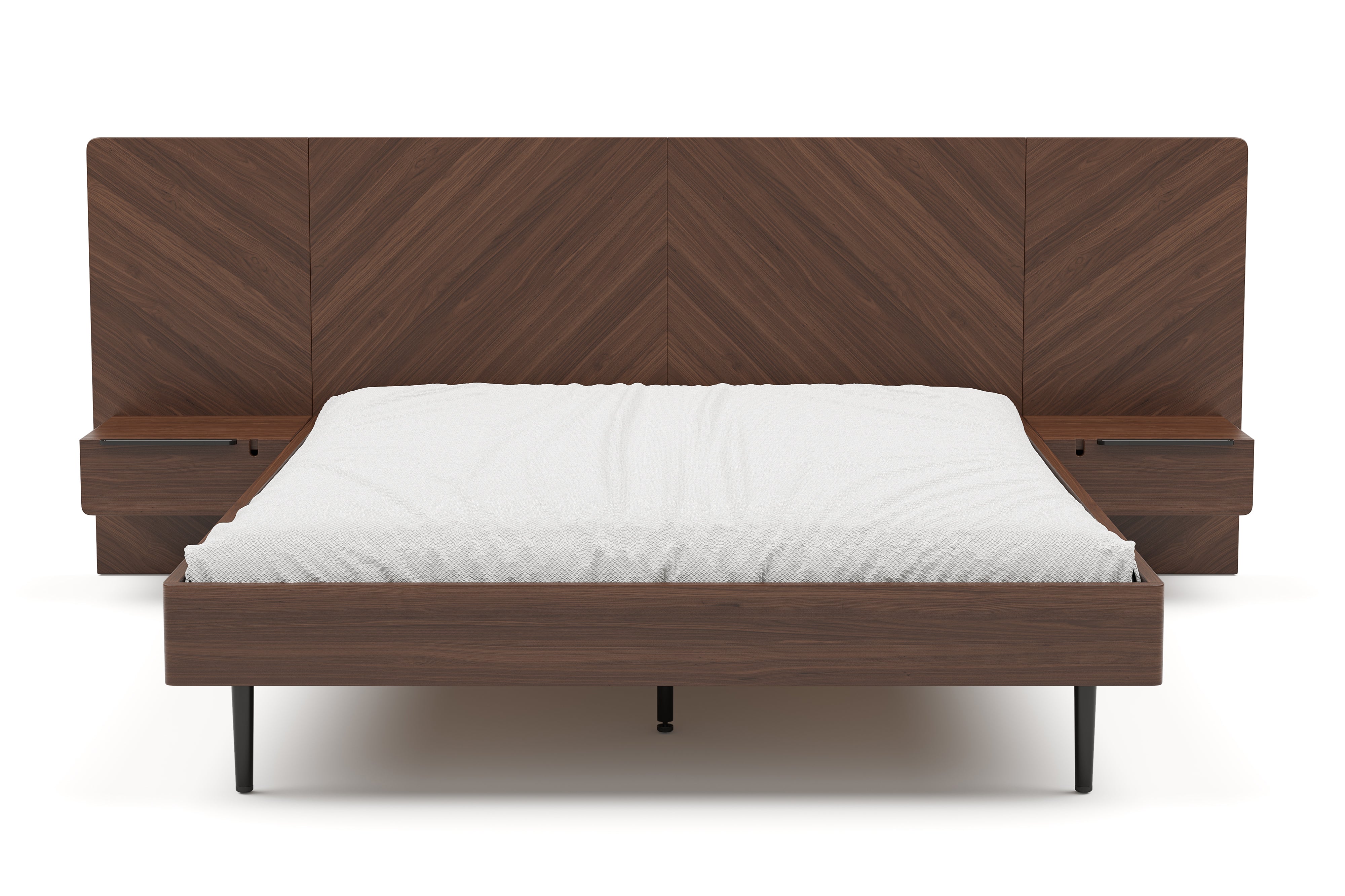 Experience the Ava Wood Bed: a fusion of modernity and nature. Crafted from solid wood and veneer, its chevron-patterned headboard radiates warmth while offering discreet cord management and soft-close drawers in the nightstand extensions. Supported by steel legs, this bed accommodates a 10"H mattress without needing a box spring. Revel in its central support system and built-in headboard drawers, embracing the natural beauty of wood with included slats. Embrace the unique charm of authentic wood furniture—each piece carries its distinct color and texture variations, a testament to its genuine craftsmanship. Redefine your sleep space with the Ava Bed's seamless blend of style and functionality.