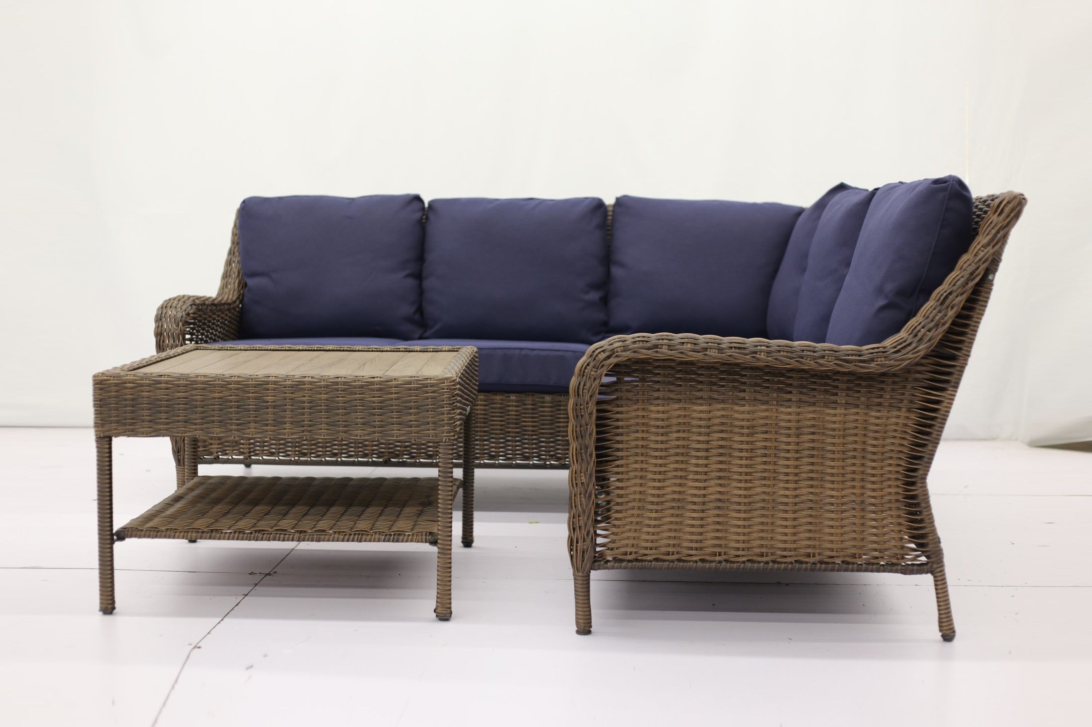 The Brendon Wicker Outdoor Left Arm Chaise Sectional is made for easy outdoor comfort. This set includes a chaise, middle chair, loveseat, coffee table, and end table. Its powder-coated steel frame and all-weather resin wicker are strong and easy to maintain. Plush, water-resistant cushions stay dry and resist fading. With wide arms and deep seats, it’s the perfect spot to stretch out and relax.