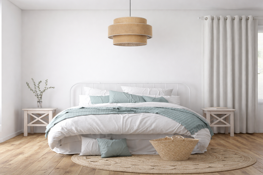 - Natural woven jute shade brings organic texture and warm, earthy character to modern interiors.