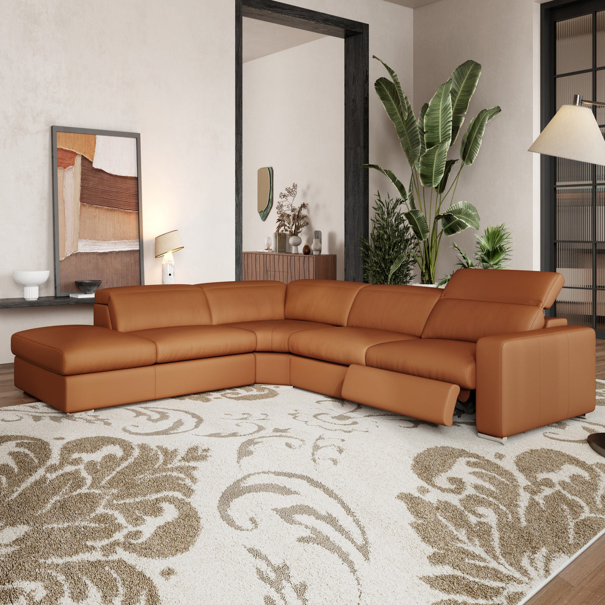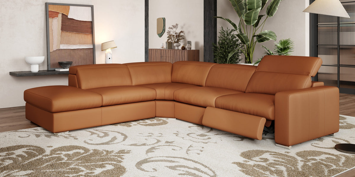 Introducing the Clara Leather Reclining Sectional Sofa, your ultimate comfort haven. Upholstered in luxurious Italian Nappa 11000 top-grain leather on all seating surfaces, it offers both style and durability. With two electric motion recliners and adjustable headrests, finding your perfect relaxation spot is effortless. Crafted with a sturdy kiln-dried wood frame and accented with exquisite heavy stitching, it's as durable as it is stylish. Elevate your lounging experience with the Clara Reclining Sectional Sofa — where luxury meets ease.