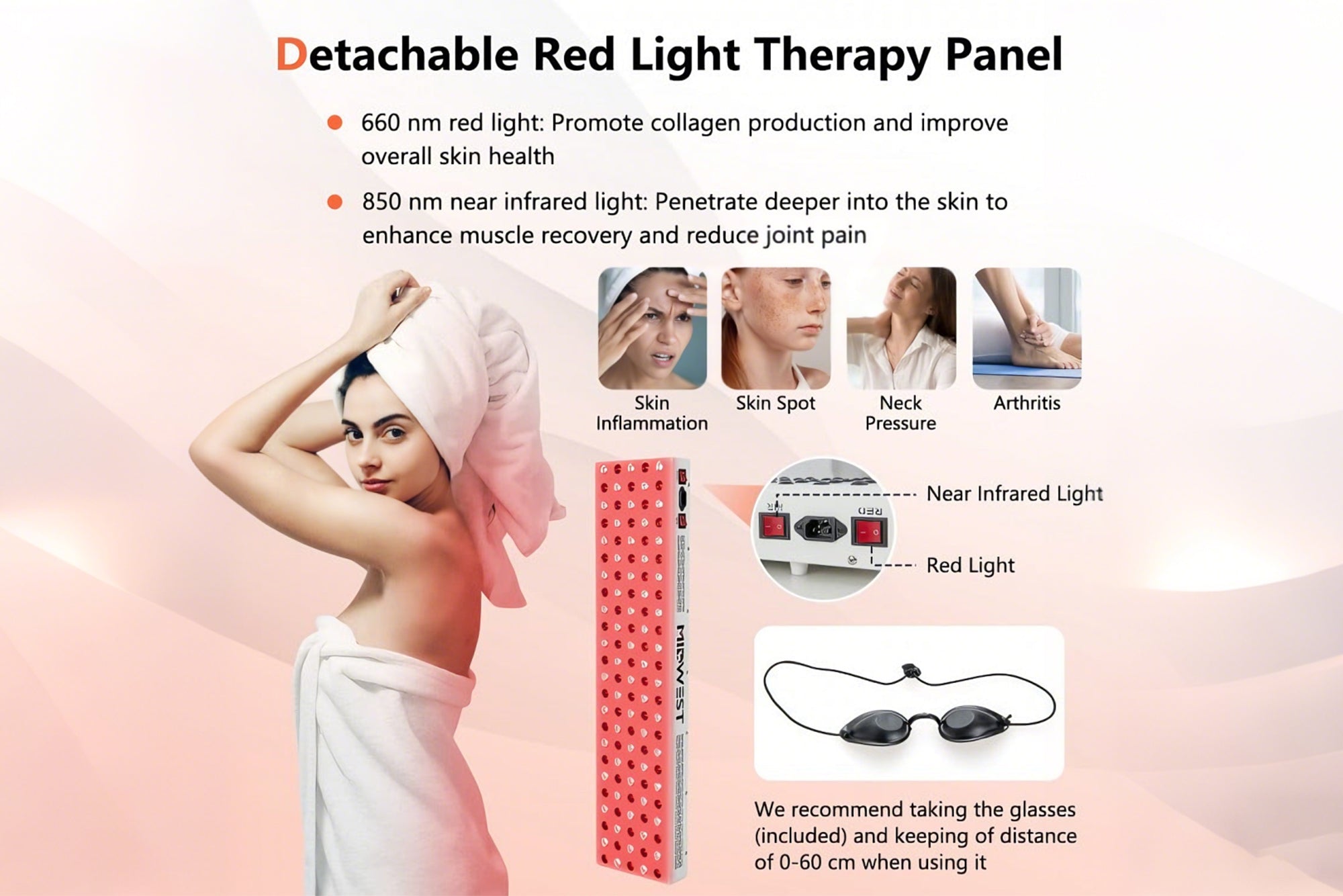 - Dual Therapy Power (Infrared + Red Light): Combining far infrared heat with 660nm and 850nm red light therapy, this sauna supports detox, muscle recovery, improved circulation, and overall wellness in one powerful session.Low EMF, Safe & Clean Technology: Built with a low-EMF heating system and near-zero VOC materials, ensuring a safer, cleaner, and more reliable home wellness experience.