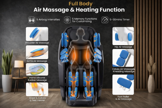 - Airbag Massage and Heating and Foot Rollers: The 54 airbags are located on the shoulders, arms, calves, and feet to provide pressure massage. Hand silicone rubber massage and waist and calves and feet heating function relieve your soreness. Moreover, the foot rollers stimulate the acupoints deeply for further relaxation.