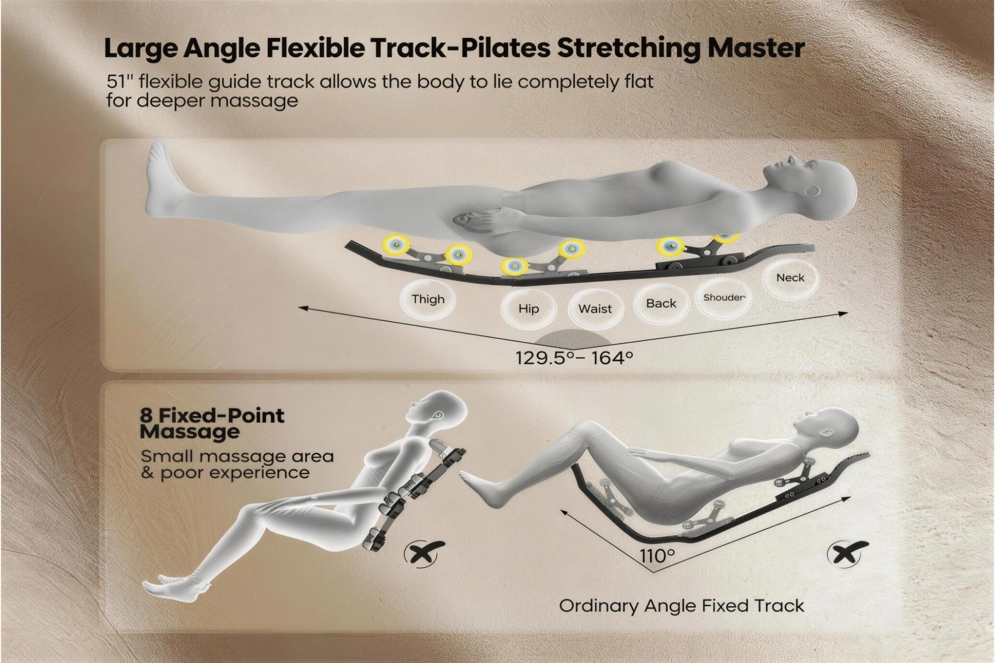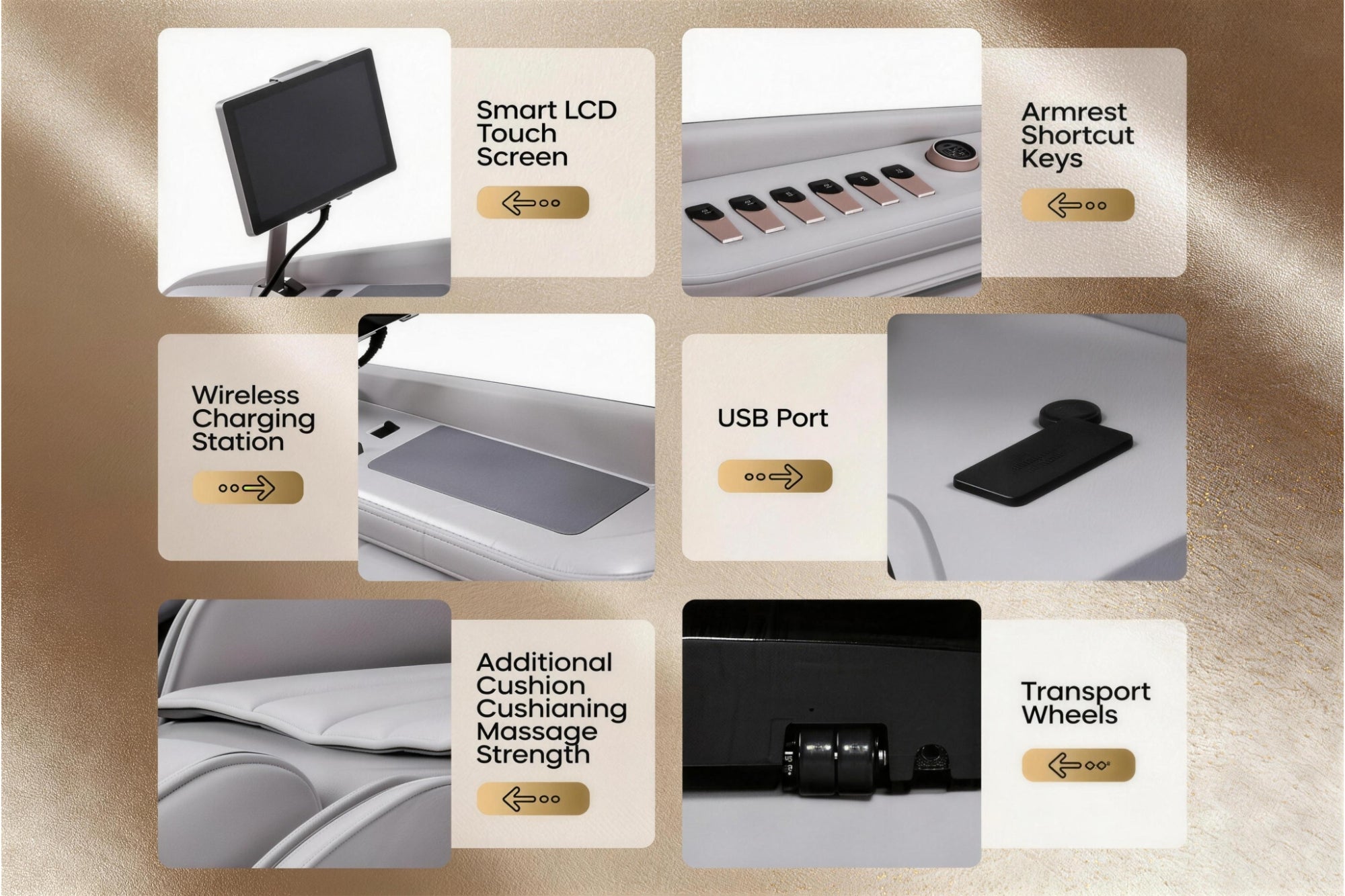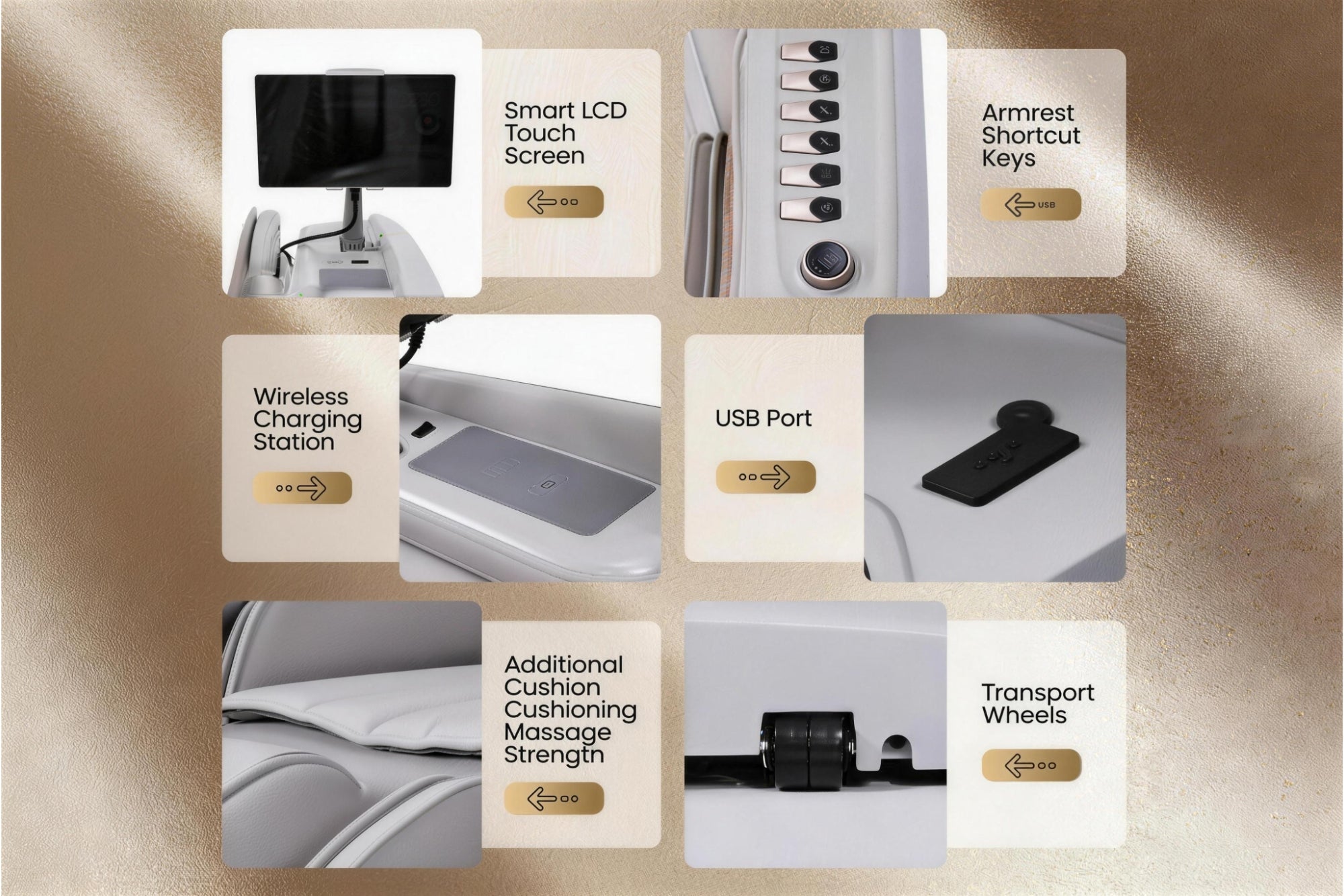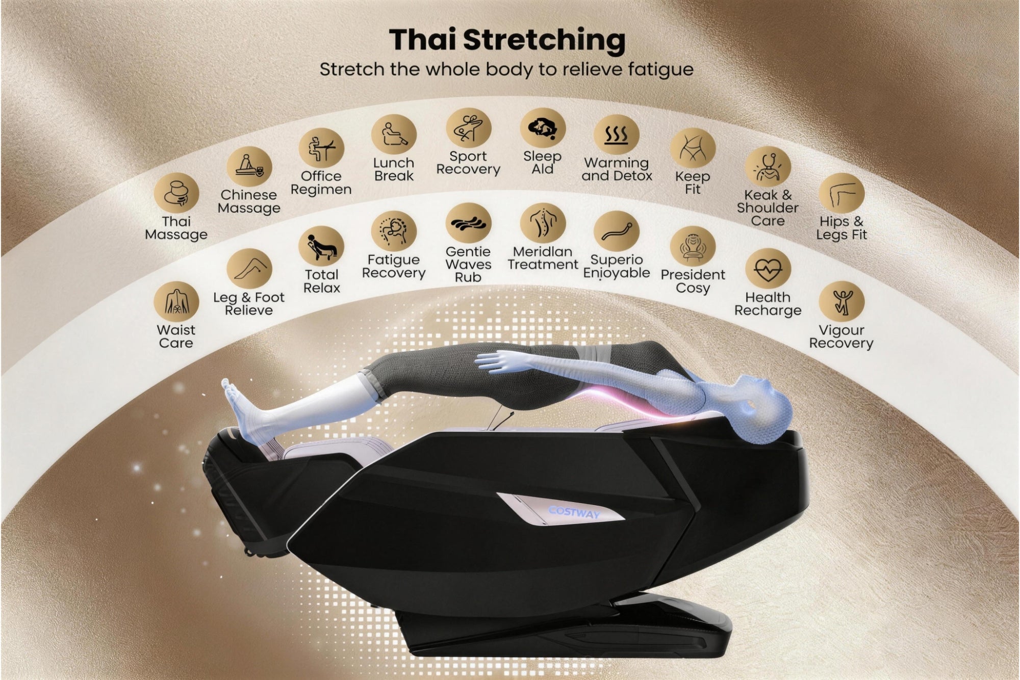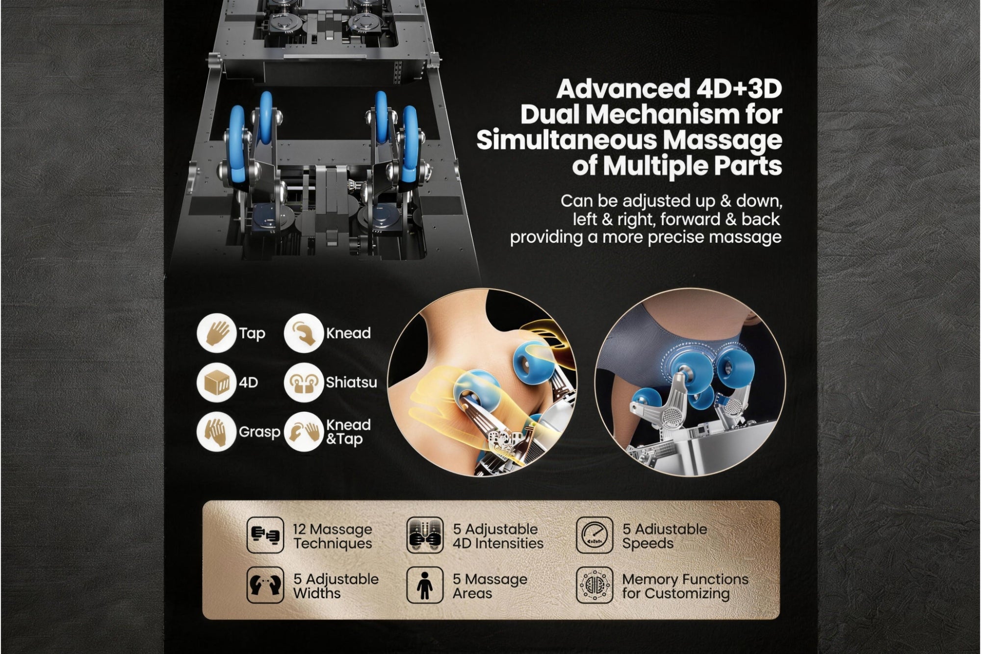 Costway Kenzo 2025 Premium 4D+3D Zero Gravity Full Body Massage Chair delivers a luxury wellness experience with an advanced dual roller system, hybrid flex track, and intelligent body scan for precise full-body relief. Designed to reduce stress, ease muscle tension, and improve circulation, it features 3-stage zero gravity recline, Thai stretch, waist and calf heating, calf and foot rollers, and 42 airbags for deep comfort. Smart features include heart rate monitoring, health detection, voice control, premium touch screen, Bluetooth speakers, wireless charging, fragrance therapy, and memory settings for a fully customized massage at home.