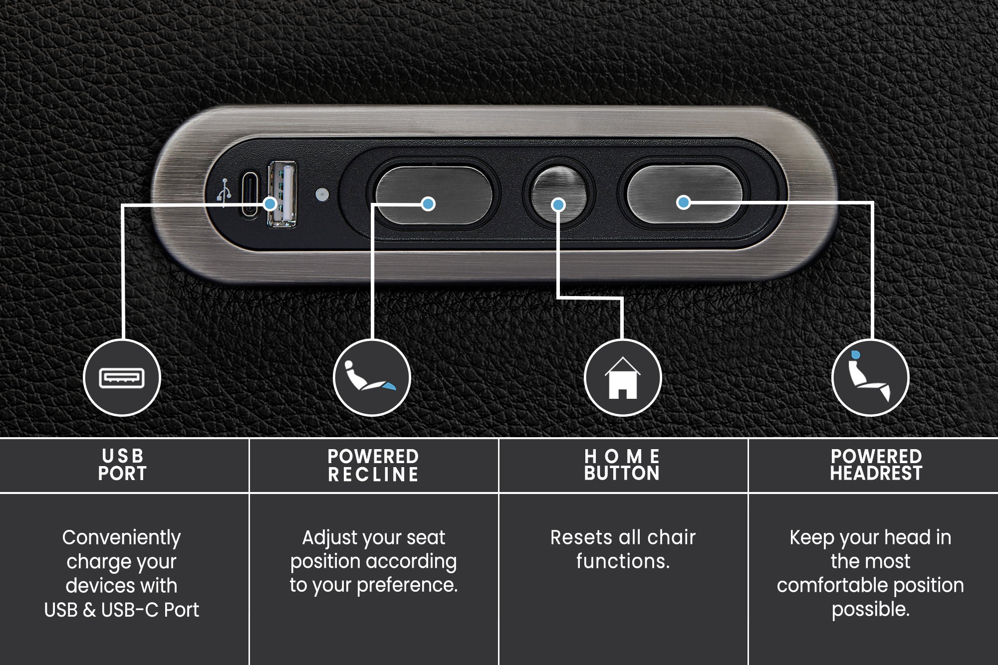 - Convenient USB-A and USB-C charging ports on the inside armrests keep devices powered while you relax.
