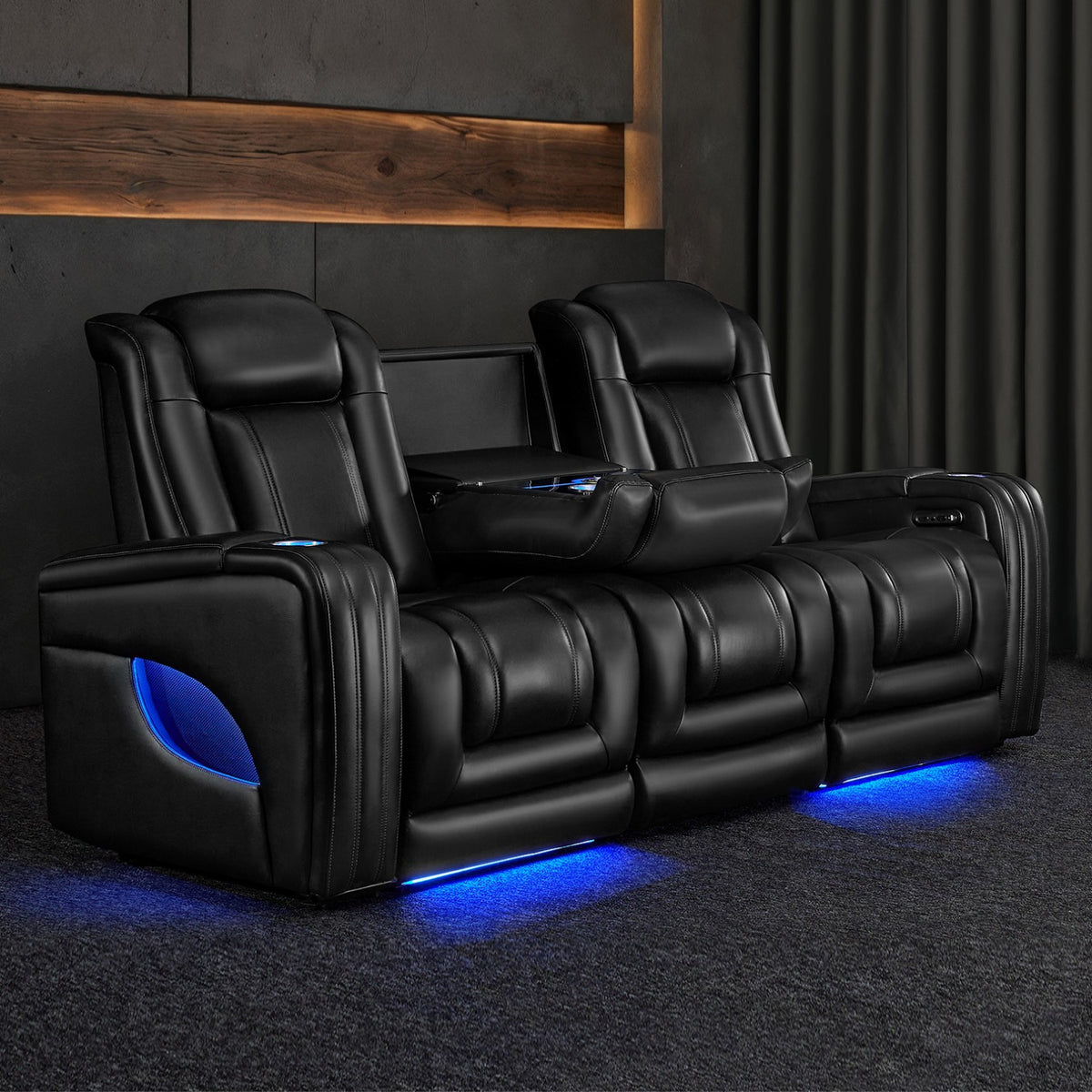 - The center seat folds down to reveal an anti-fingerprint acrylic panel featuring RGB ambient lighting, dual cup holders, 15W wireless chargers, and an integrated display controller—keeping every comfort within reach.