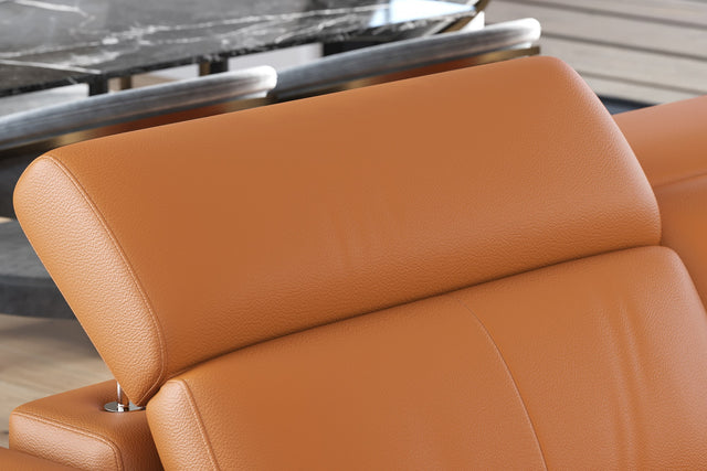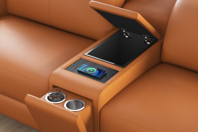 Introducing the Elodie Leather Loveseat with Console Sofa, where style meets innovation and comfort. This contemporary piece features Italian Nappa 11000 Top Grain Leather on all seating surfaces, offering a blend of style and practicality. Dive into relaxation with adjustable manual headrests and seamless electric recliners discreetly nestled within the sleek design. Engineered with an upscale Kiln-Dried Hardwood frame, it combines style and stability. Enjoy ultimate comfort with a supportive base suspension, high-density cushions, cup holders, and convenient USB charger controls, granting individual adjustments for reclining and headrests. Experience sophistication and indulgence at its finest with the Elodie Leather Sofa.