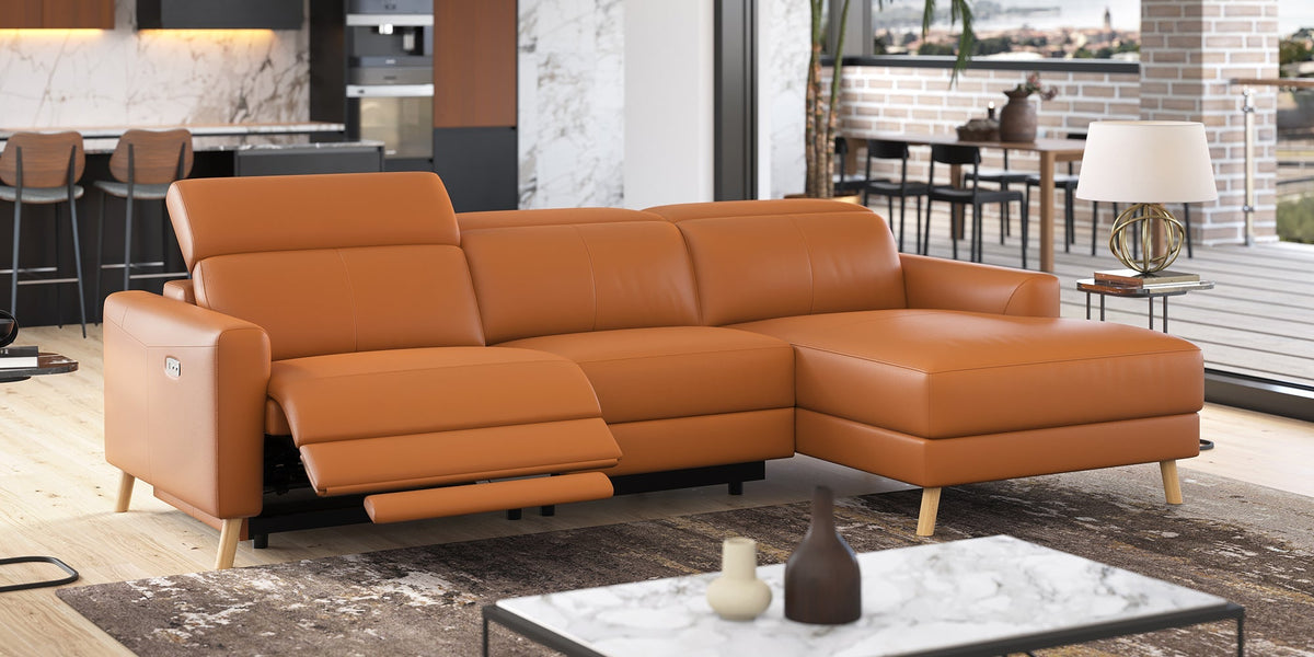 Introducing the Elodie Leather Sectional Sofa where style meets innovation and comfort. This contemporary piece is crafted from supple Italian Nappa 11000 Top Grain Leather and boasts elegance and practicality. Dive into relaxation with adjustable manual headrests and seamless electric recliners discreetly nestled within the sleek design. Engineered with an upscale Kiln-Dried Hardwood frame and light timber legs, it combines style and stability. Enjoy ultimate comfort with a supportive base suspension, high-density cushions, and convenient USB charger controls, granting individual adjustments for reclining and headrests. Experience sophistication and indulgence at its finest with the Elodie Leather Sofa.