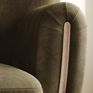 Experience a world of refined elegance with our Emerald Accent Chair. This exceptional piece balances vintage allure with modern flair to create a truly breathtaking aesthetic. The chair's stunning refurbished appearance, enriched with seductive curves and a tight, plushy backrest, is matched by a deluxe cushioned seat that delivers unparalleled comfort. The resplendent inset wood accents on the arms, pleated tailoring, and bold, dowel-shaped oak legs add dimension and depth to the overall design. Relax in its sumptuous olive-green velvet upholstery that surrounds you with an alluring, plush embrace. Introduce an air of sophistication to your space with this one-of-a-kind masterpiece that embodies extravagance in every detail.