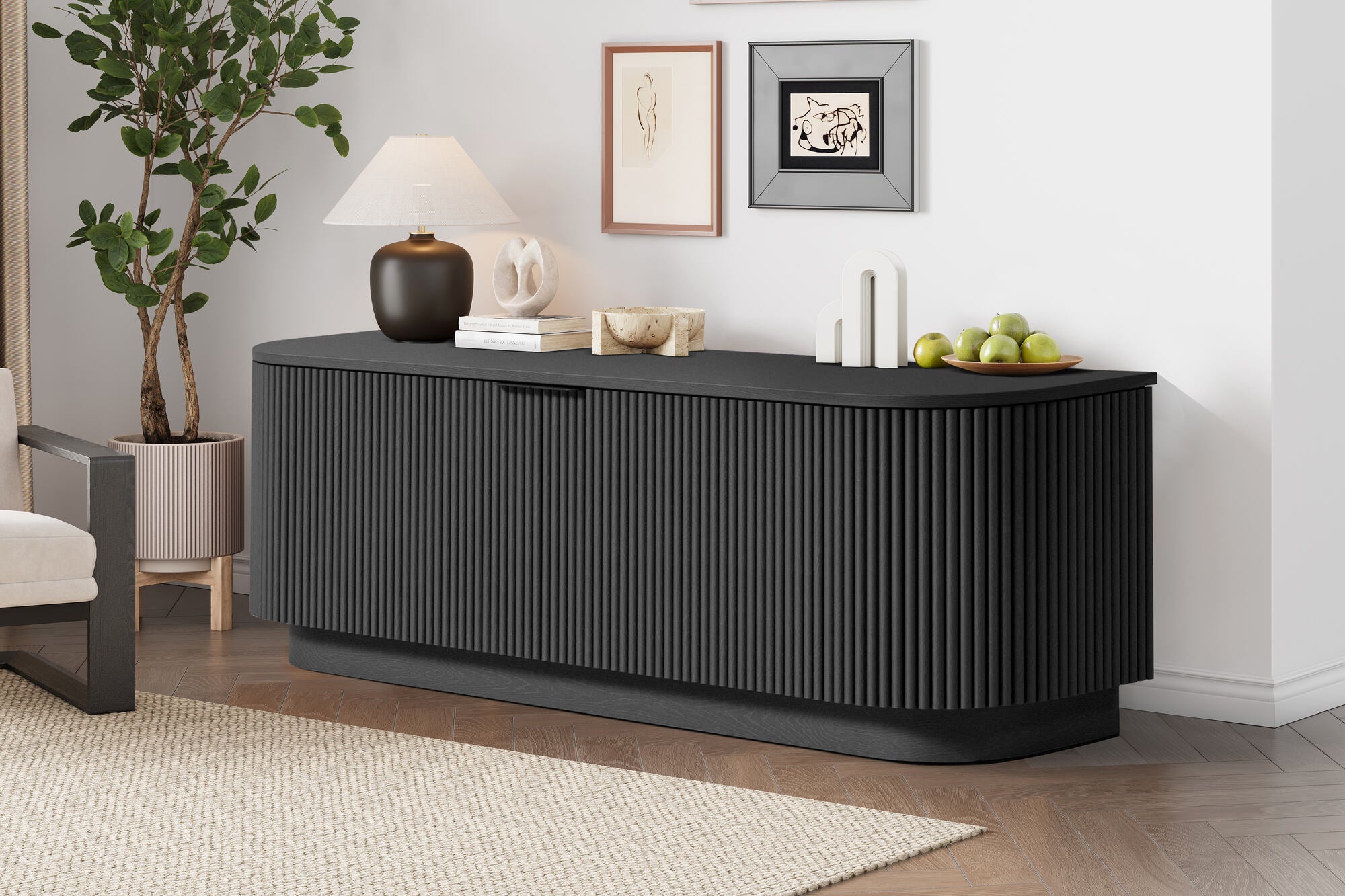 - Modern Design: Features an black tambour finish with slim black matte metal handles for a sleek and stylish look.