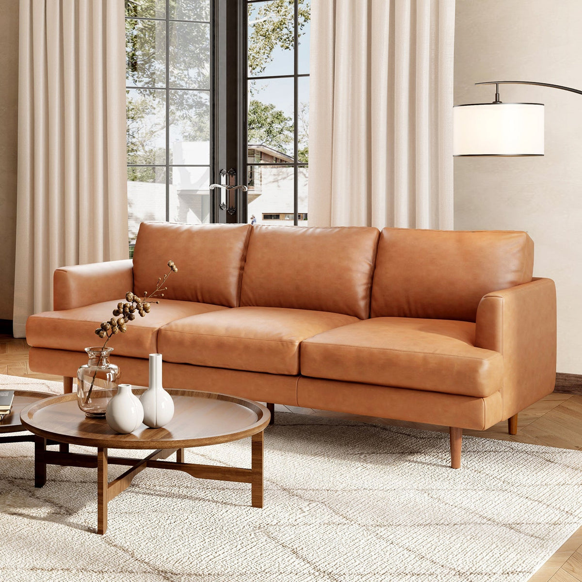 The Grosseto sofa is designed for luxury with its rich cognac Italian top-grain leather upholstery, strong lines, and cushions that invite you to sink in comfortably. Crafted with meticulous attention to detail, including double-stitched seams, hand-folded corners, and corner blocked solid wood framing, our luxurious leather couch showcases exceptional construction quality. The slender wooden legs offer stability while maintaining an elegant profile.