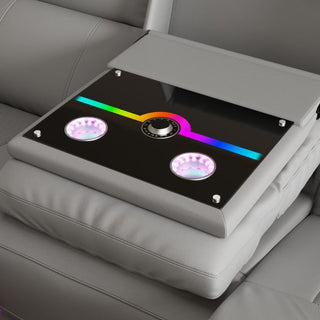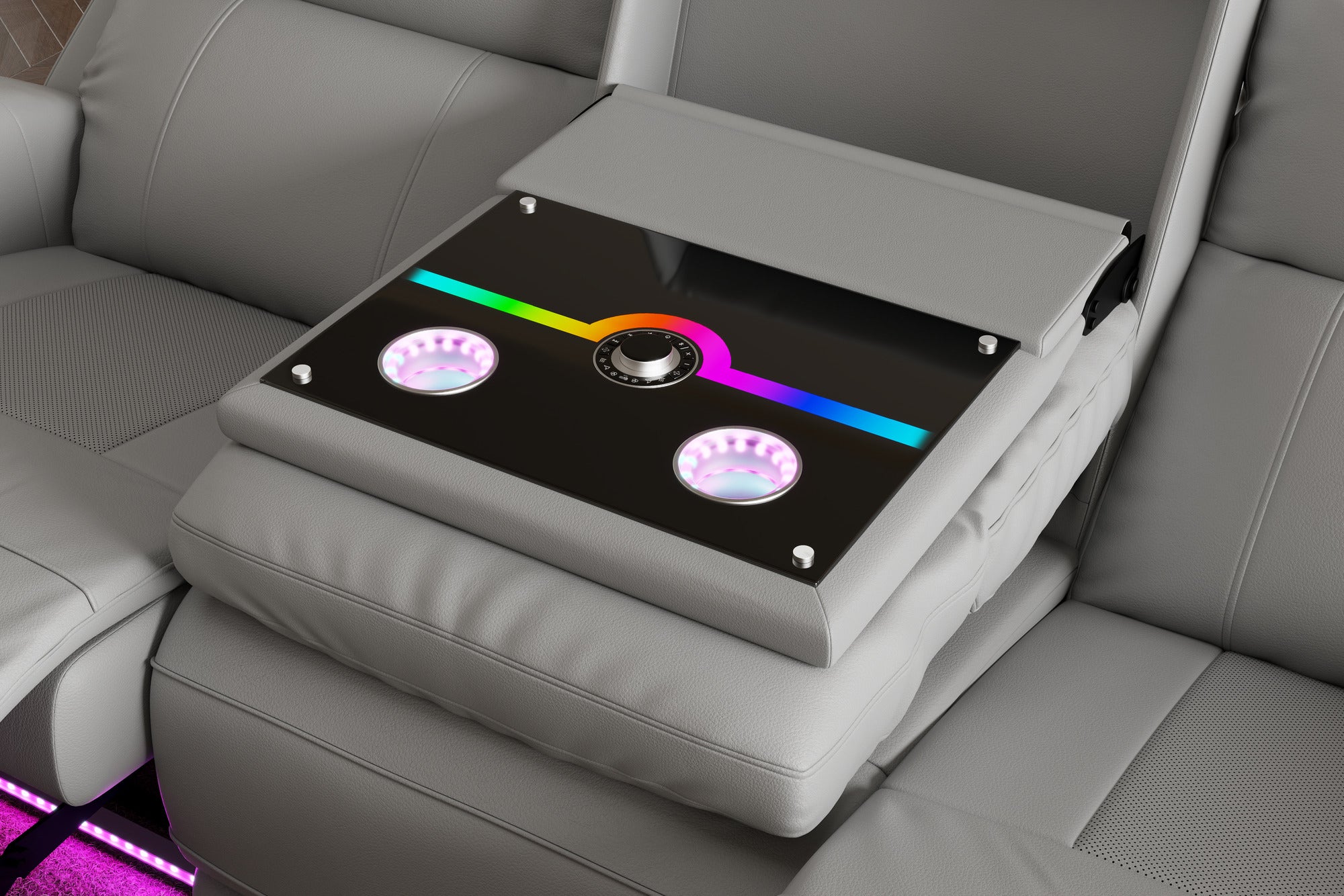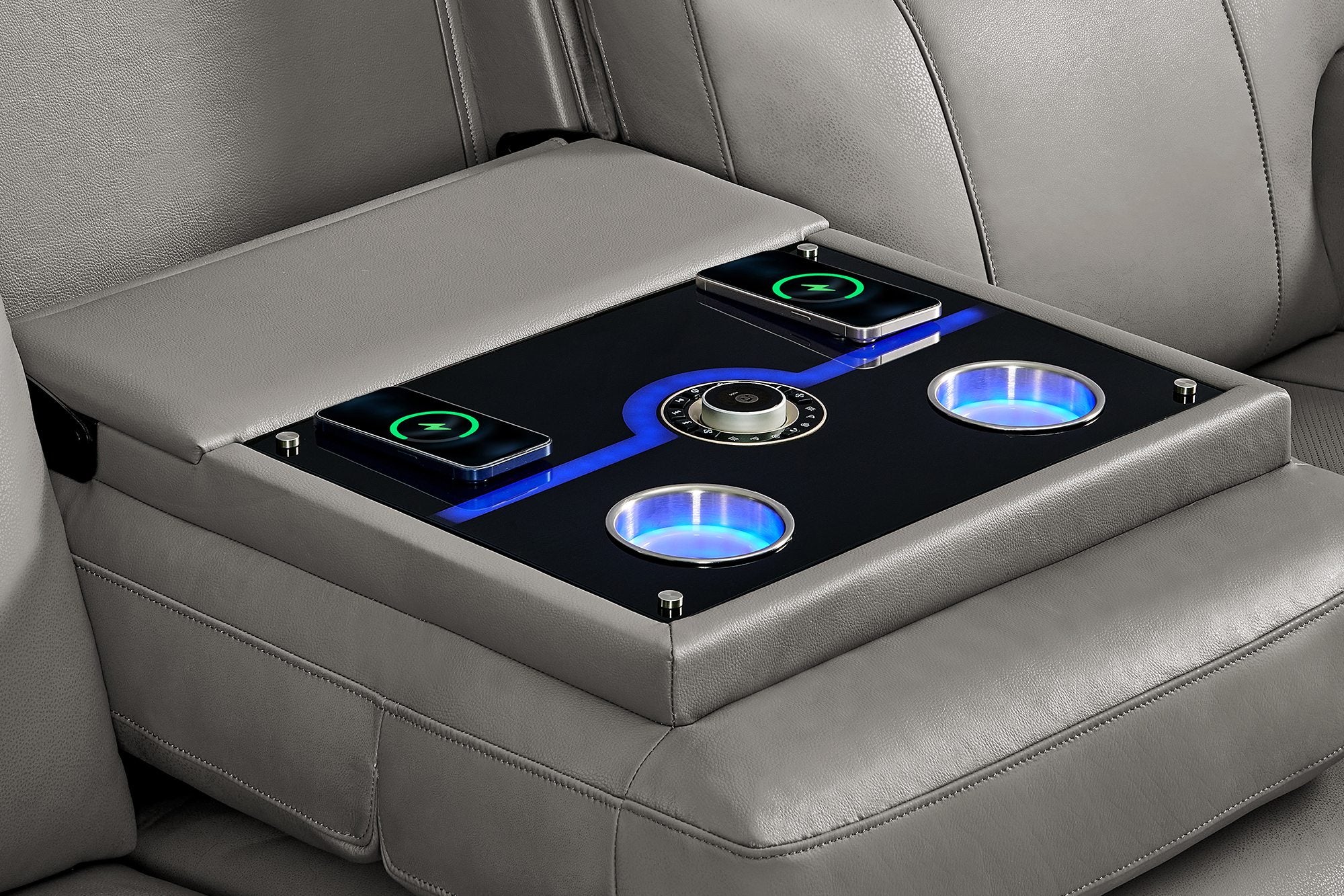 - The center seat folds down to reveal an anti-fingerprint acrylic panel featuring RGB ambient lighting, dual cup holders, dual 15W wireless chargers, and an integrated display controller—keeping every comfort within reach.