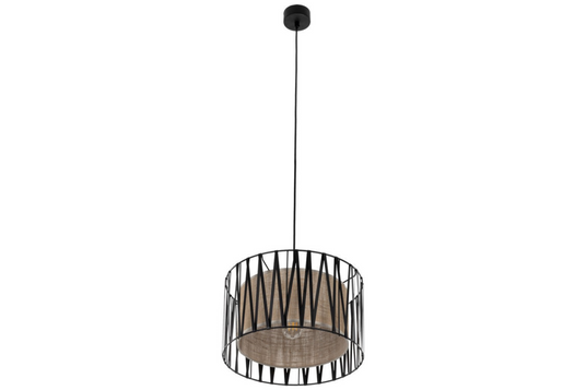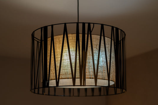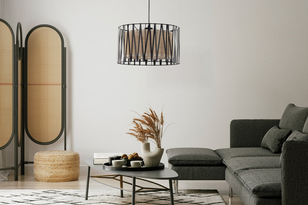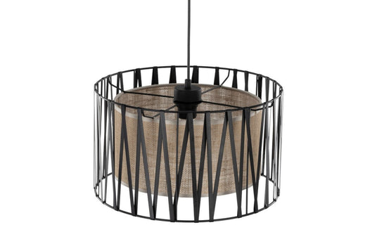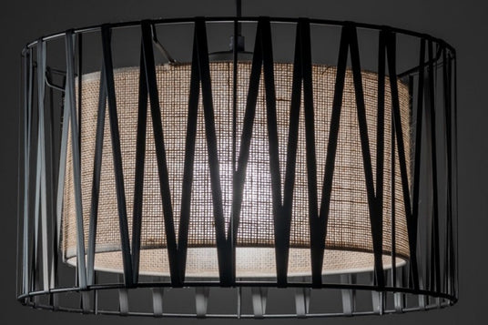 - Featuring a distinctive jute lampshade with a metal basket wrapped in a black ribbon-like finish, this pendant adds organic texture and contemporary elegance to your space.