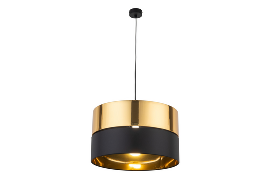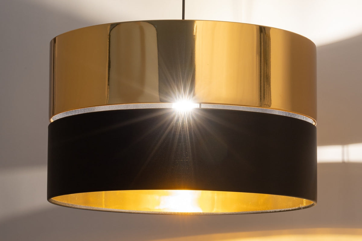 The HILTON lamp family stands out with its striking combination of black and gold. Instead of a standard two-color design, these lamps feature a unique setup with two lampshades spaced one centimeter apart. This gap creates a decorative effect during the day and reveals its true charm when the lamp is lit. As the light filters through the gap, it casts a subtle glow along the ceiling or walls. A distinctive feature of the HILTON lamps is the inner layer of gold foil inside the lampshade. This foil reflects light and enhances the illumination escaping through the gap, adding a touch of sophistication to your space.