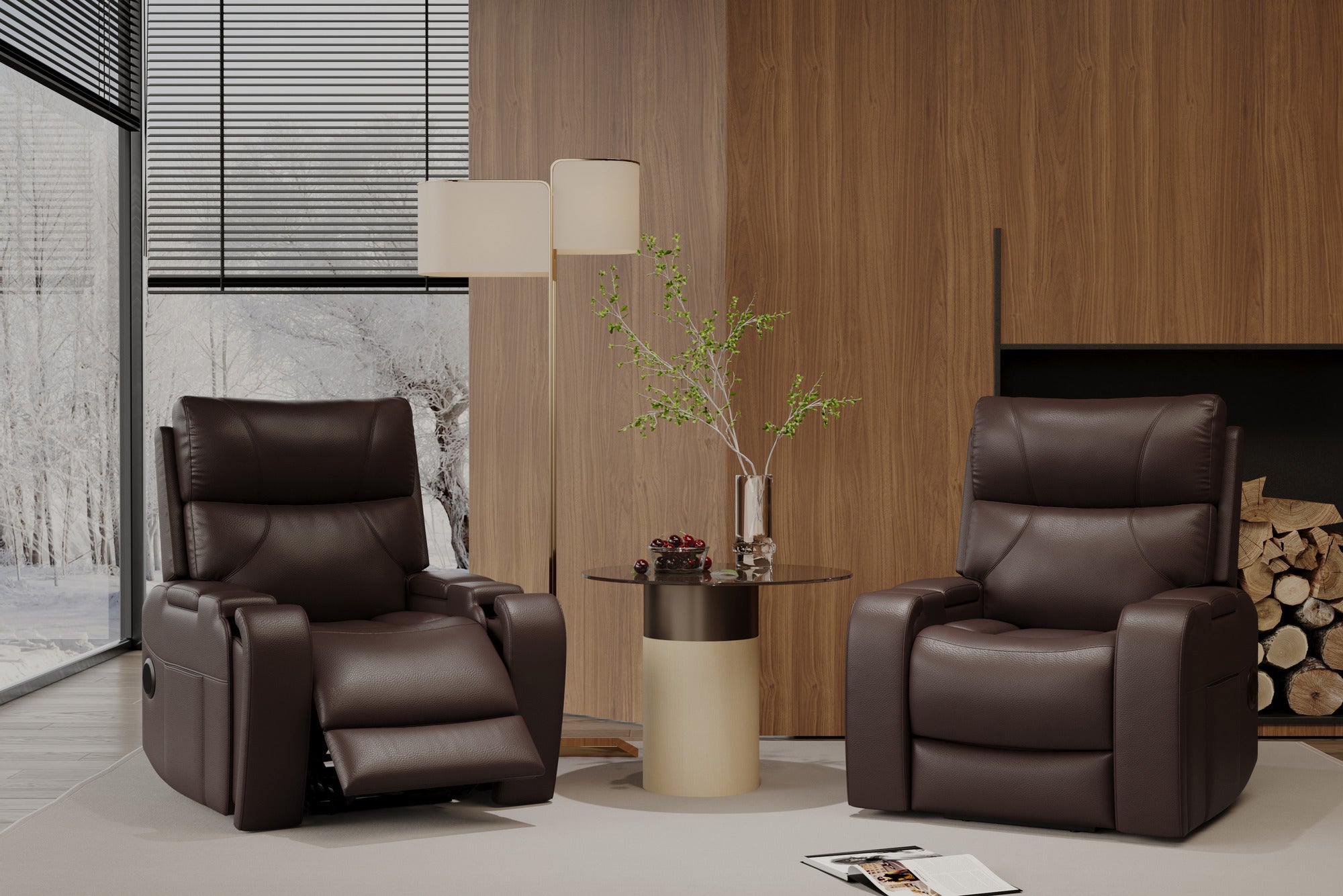 Armrest Layout: One armrest serves as a charging hub with wireless charging and USB ports, while the other integrates a cup holder for drinks within reach.