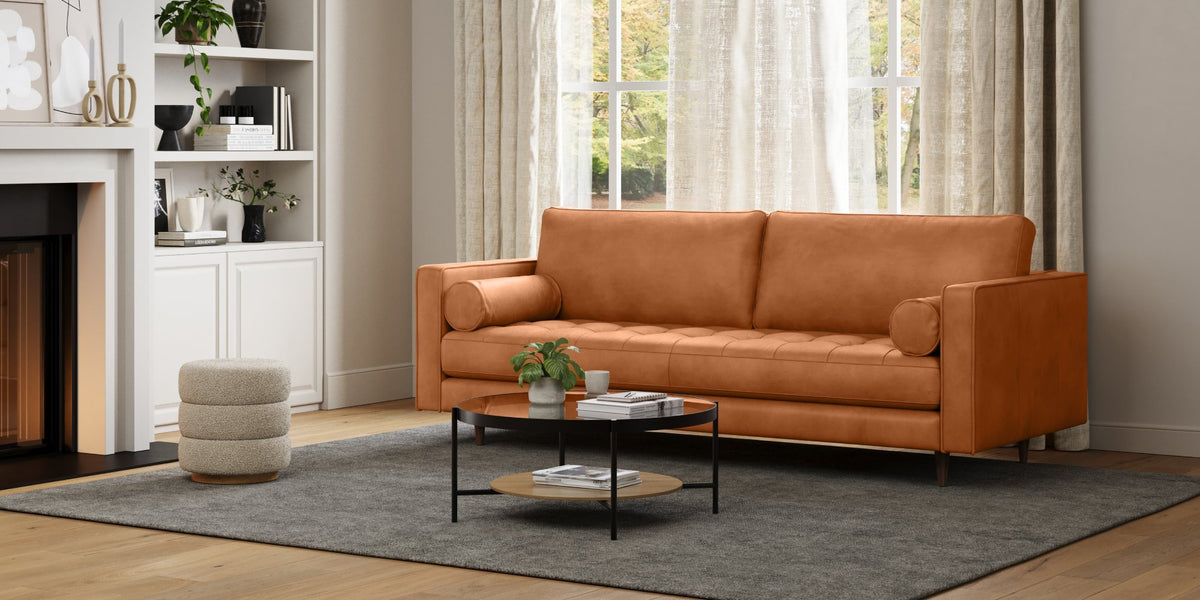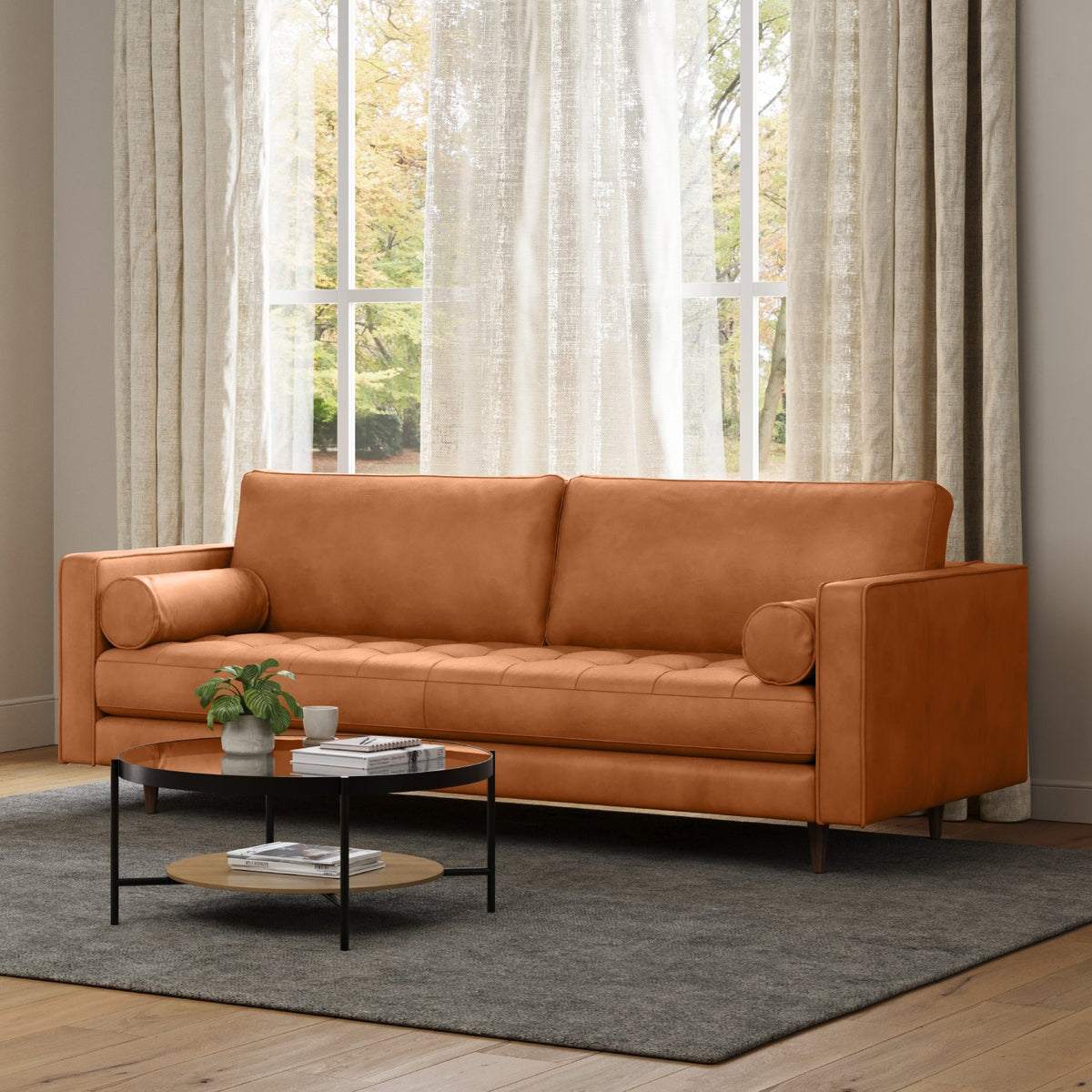 The Isabella leather sofa is more than furniture — it's your ultimate companion. Its tufted bench seat invites extended lounging sessions, while overstuffed cushions and round bolsters offer unwavering support in any posture. As time goes on, the top-grain leather forms a captivating vintage patina, further enhancing the natural color variations, wrinkles, and creases that define its uniqueness. It doesn’t matter if you are lounging or just enjoying the view, the Isabella leather sofa is the perfect addition to any living space.