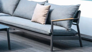 The Lena Aluminum Outdoor Conversational Set combines modern design with ultimate comfort. Featuring low-slung seating and bold, clean lines, this set offers a minimalistic profile without sacrificing relaxation. Plush, weather-resistant cushions provide deep seating for long-lasting comfort, while teak detailing on the armrests adds an elegant touch. A sturdy, lightweight powder-coated aluminum frame ensures durability, while the coffee table's tempered glass top enhances the set’s refined, contemporary aesthetic. Ideal for any outdoor space, it delivers both style and functionality.