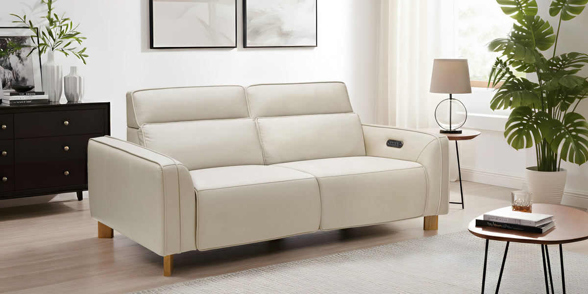 The Lesley Leather Recliner Sofa combines luxury and comfort with ease. Wrapped in high-quality Italian Nappa 11000 Top Grain Leather, it adds style to any room. The sturdy kiln-dried wood frame ensures durability. With powered zero-gravity reclining and adjustable telescopic headrests, you can comfortably relax. A built-in control panel with USB and Type-C charging ports keeps your devices powered. The seat cushions are soft foam with polyester fiber, while the backrest has a cozy feather-filled design. Add the optional console with retractable drink holders and hidden storage, matching the sofa’s ash timber legs for a complete look.
