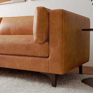 Introducing the Mary Top Grain Nappa Full Leather Wide Wide Sofa, a true epitome of opulence and endurance. Draped in exquisite Top Grain Nappa Italian 11000 Full Leather, its cognac hue unveils the raw beauty of the hide, destined to age gracefully into a captivating vintage patina. Crafted on a corner-blocked solid wood frame supported, this sofa ensures durability and stability. Delve into the comfort of high-density foam coupled with a feather-down topper, offering a luxurious seating experience. Its loose, zip-off cushion covers in a feather down and fiber blend provides both comfort and practicality. Elevated by solid rubberwood legs in a rich walnut finish, this Wide Sofa exudes timeless elegance, a perfect fusion of luxury and resilience.