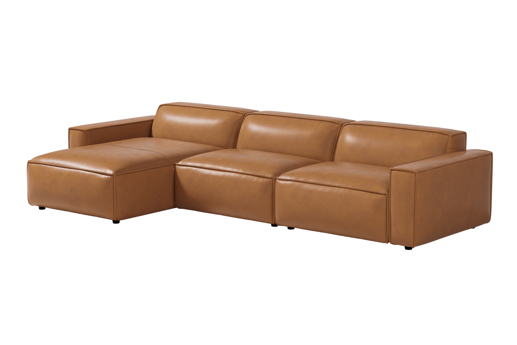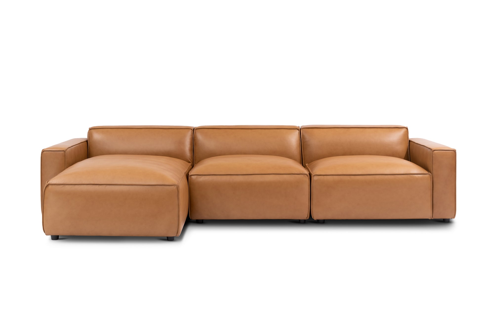 Create the perfect lounging space with the Nathan Leather Modular Sectional Sofa set—a classic design crafted from high-quality full aniline leather that complements any décor. The semi-firm seats offer unbeatable comfort, while the versatile design allows for peaceful lounging. Customize your seating arrangement by adding individual pieces to the three-piece set. With a structure made of solid and reinforced multilayer wood and high-resilience polyurethane foam for comfort. The medium-firm seat set is finished on all sides. This masterpiece is slightly treated to maintain its natural characteristics, but avoid exposing it to direct sunlight as it may cause discolorations. Expect natural markings and color variations as well. Adding an individual piece over time or slight differences between dye lots can cause color differences. Clean with a white, soft, dry cloth and blot any spills immediately to dry naturally.