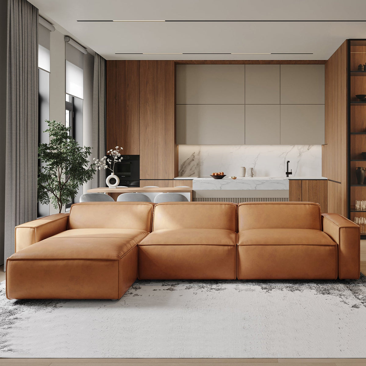 Create the perfect lounging space with the Nathan Leather Modular Sectional Sofa set—a classic design crafted from high-quality full aniline leather that complements any décor. The semi-firm seats offer unbeatable comfort, while the versatile design allows for peaceful lounging. Customize your seating arrangement by adding individual pieces to the three-piece set. With a structure made of solid and reinforced multilayer wood and high-resilience polyurethane foam for comfort. The medium-firm seat set is finished on all sides. This masterpiece is slightly treated to maintain its natural characteristics, but avoid exposing it to direct sunlight as it may cause discolorations. Expect natural markings and color variations as well. Adding an individual piece over time or slight differences between dye lots can cause color differences. Clean with a white, soft, dry cloth and blot any spills immediately to dry naturally.