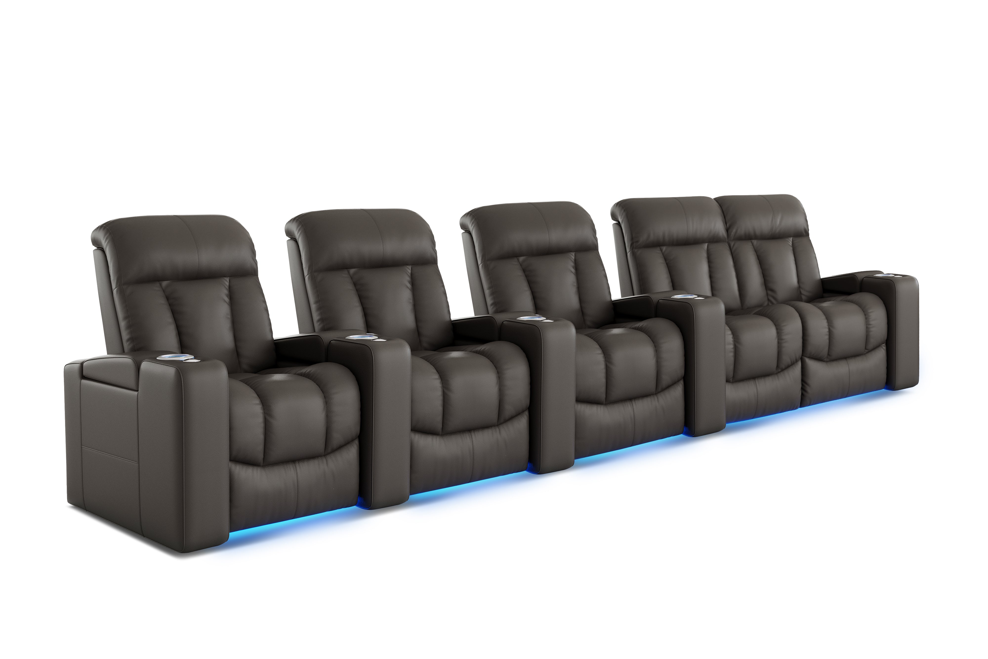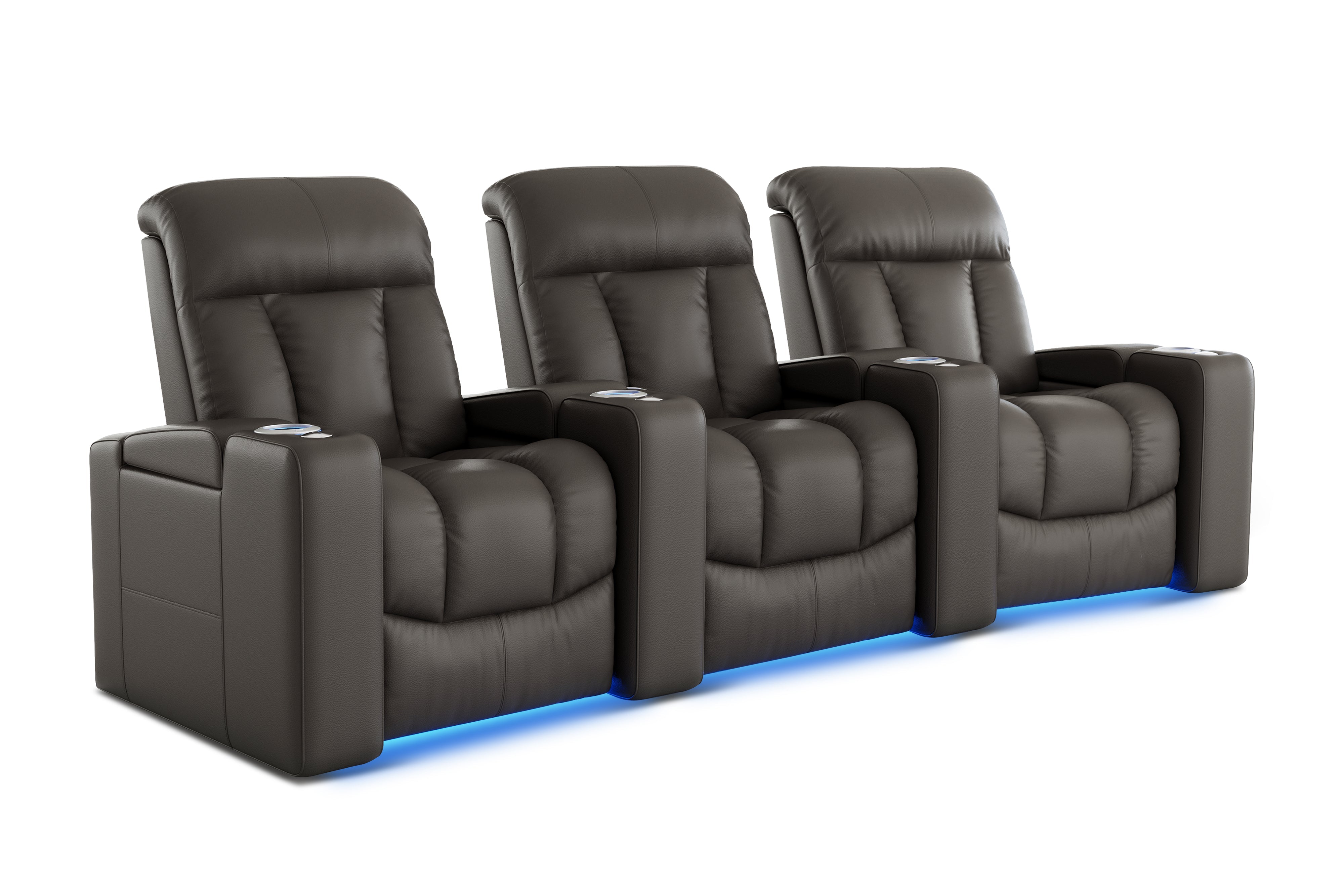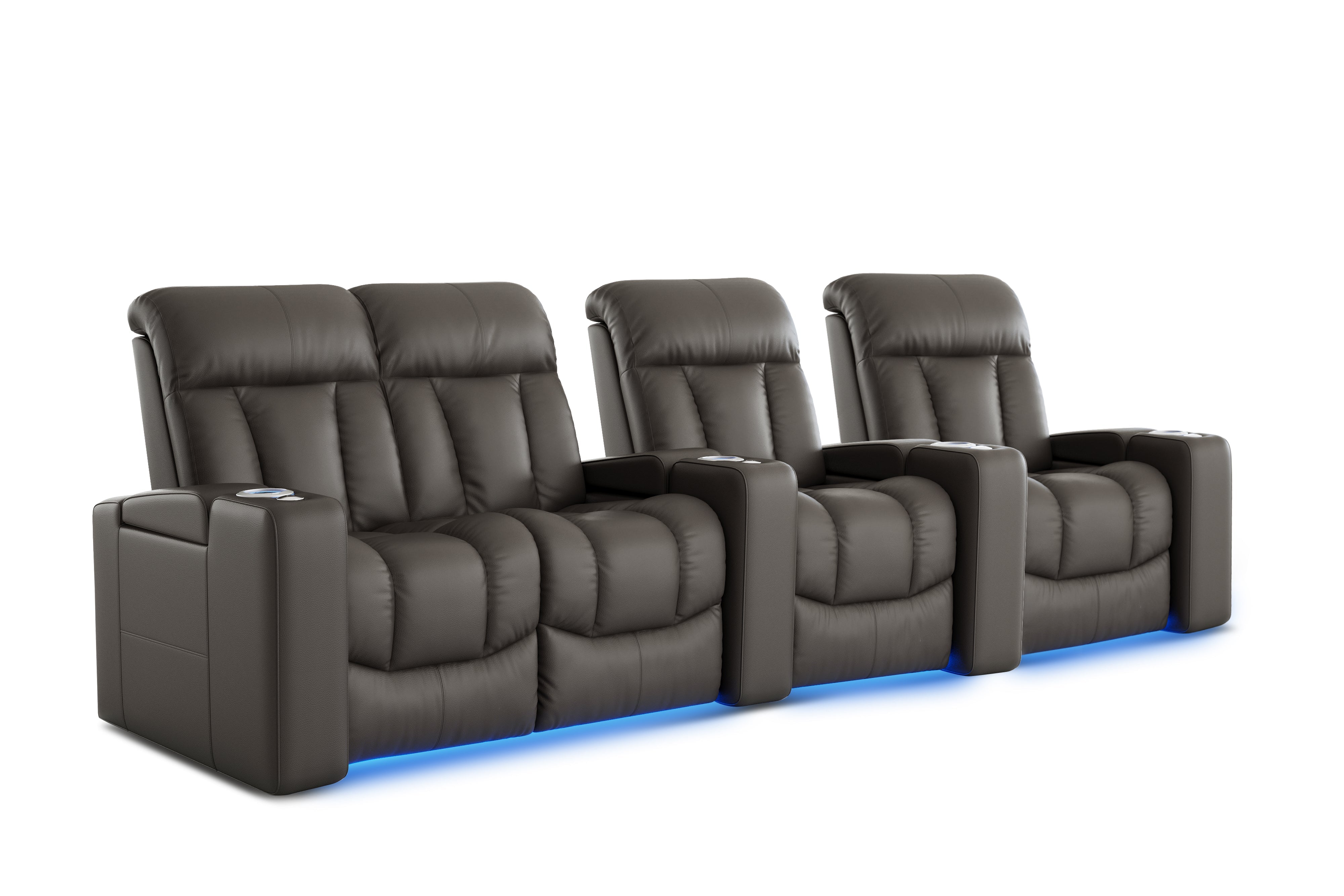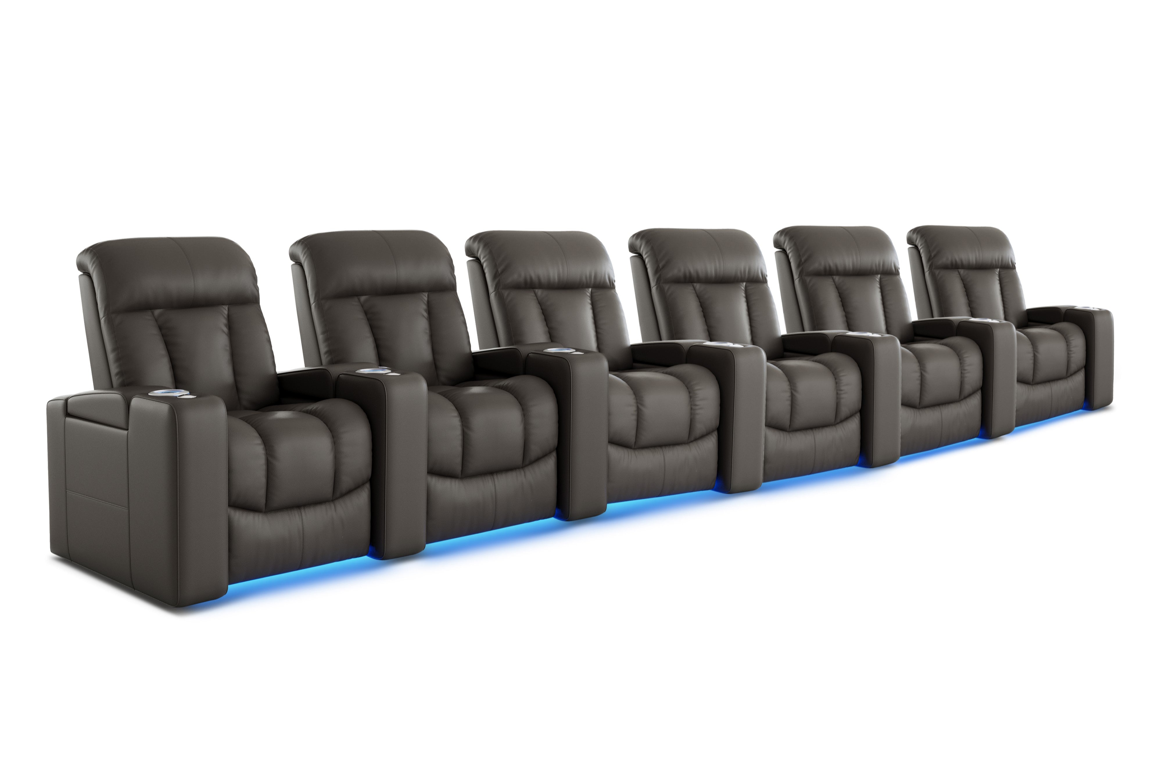 Introducing the Olivia Home Theater Seating, a luxurious addition to any home theatre. Its hallmark is a multi-color LED cupholder, offering seven colors and adjustable brightness for both style and convenience. With integrated power controls, it allows easy adjustment of the recline and headrest, ensuring personalized comfort. Olivia features plush high-back cushions filled with blown fiber and high-resilience foam seating, providing both comfort and support. Versatile in design, Olivia can be arranged in various configurations to fit any space, be it a cozy den or a grand entertainment room. It also boasts ambient ground lighting, enhancing the atmosphere in dim settings. Compatible with a range of accessories, Olivia is designed to meet the dynamic needs of modern entertainment spaces.