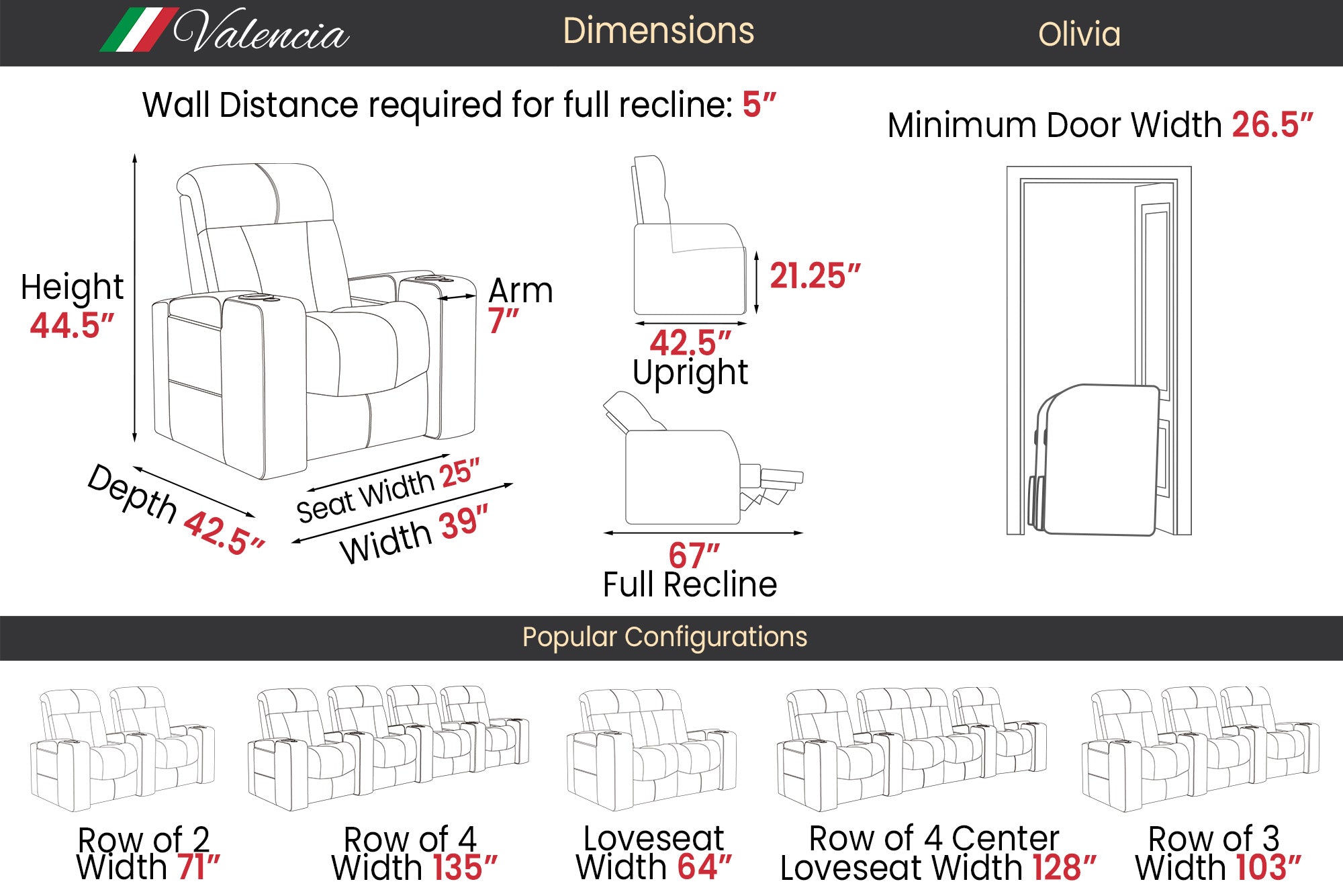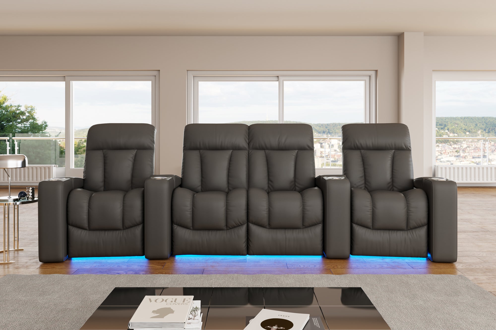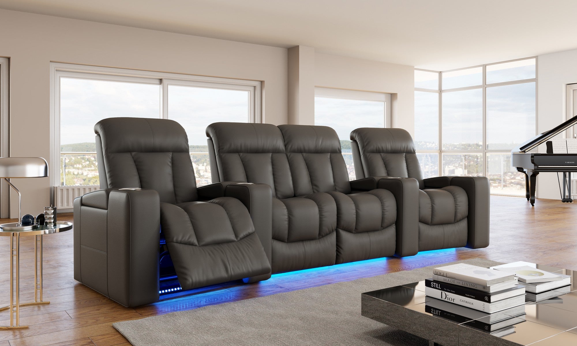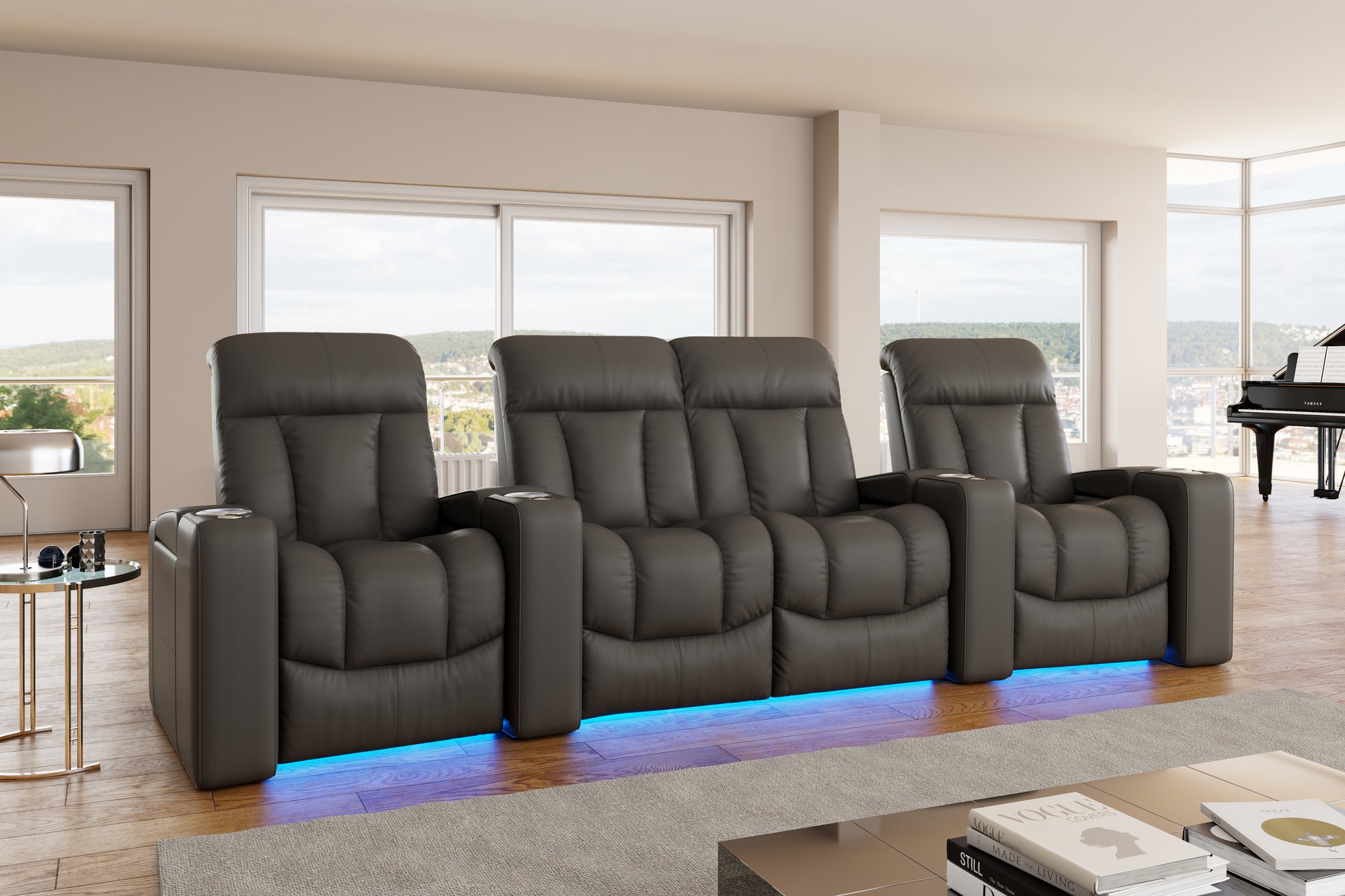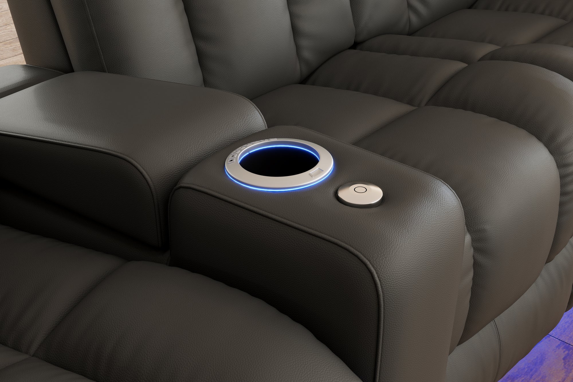 Introducing the Olivia Home Theater Seating, a luxurious addition to any home theatre. Its hallmark is a multi-color LED cupholder, offering seven colors and adjustable brightness for both style and convenience. With integrated power controls, it allows easy adjustment of the recline and headrest, ensuring personalized comfort. Olivia features plush high-back cushions filled with blown fiber and high-resilience foam seating, providing both comfort and support. Versatile in design, Olivia can be arranged in various configurations to fit any space, be it a cozy den or a grand entertainment room. It also boasts ambient ground lighting, enhancing the atmosphere in dim settings. Compatible with a range of accessories, Olivia is designed to meet the dynamic needs of modern entertainment spaces.