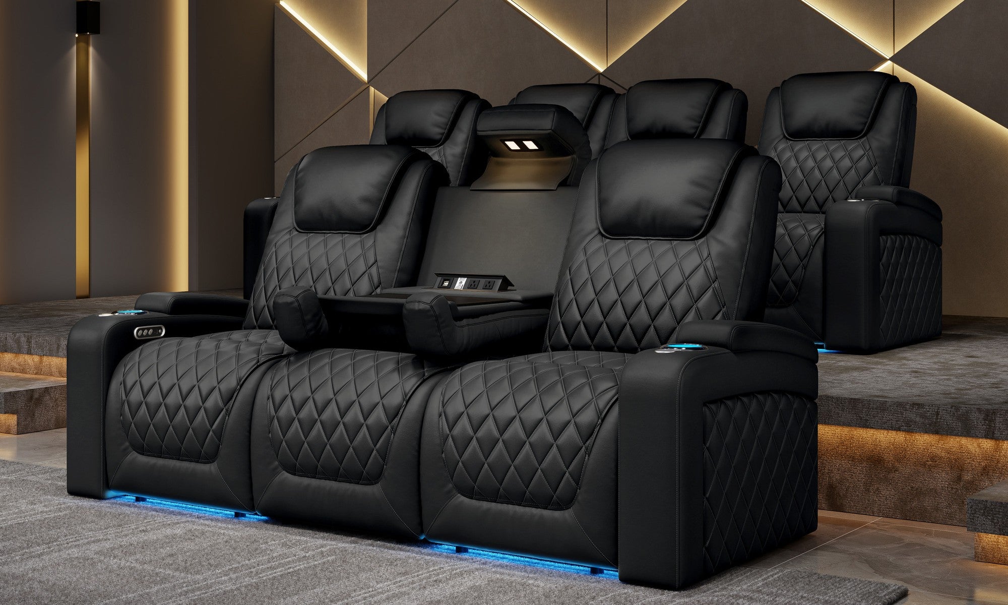 - This elegant diamond-quilted stitching detail complements your home theatre with a regal aesthetic while enhancing ergonomic comfort with added softness and support.