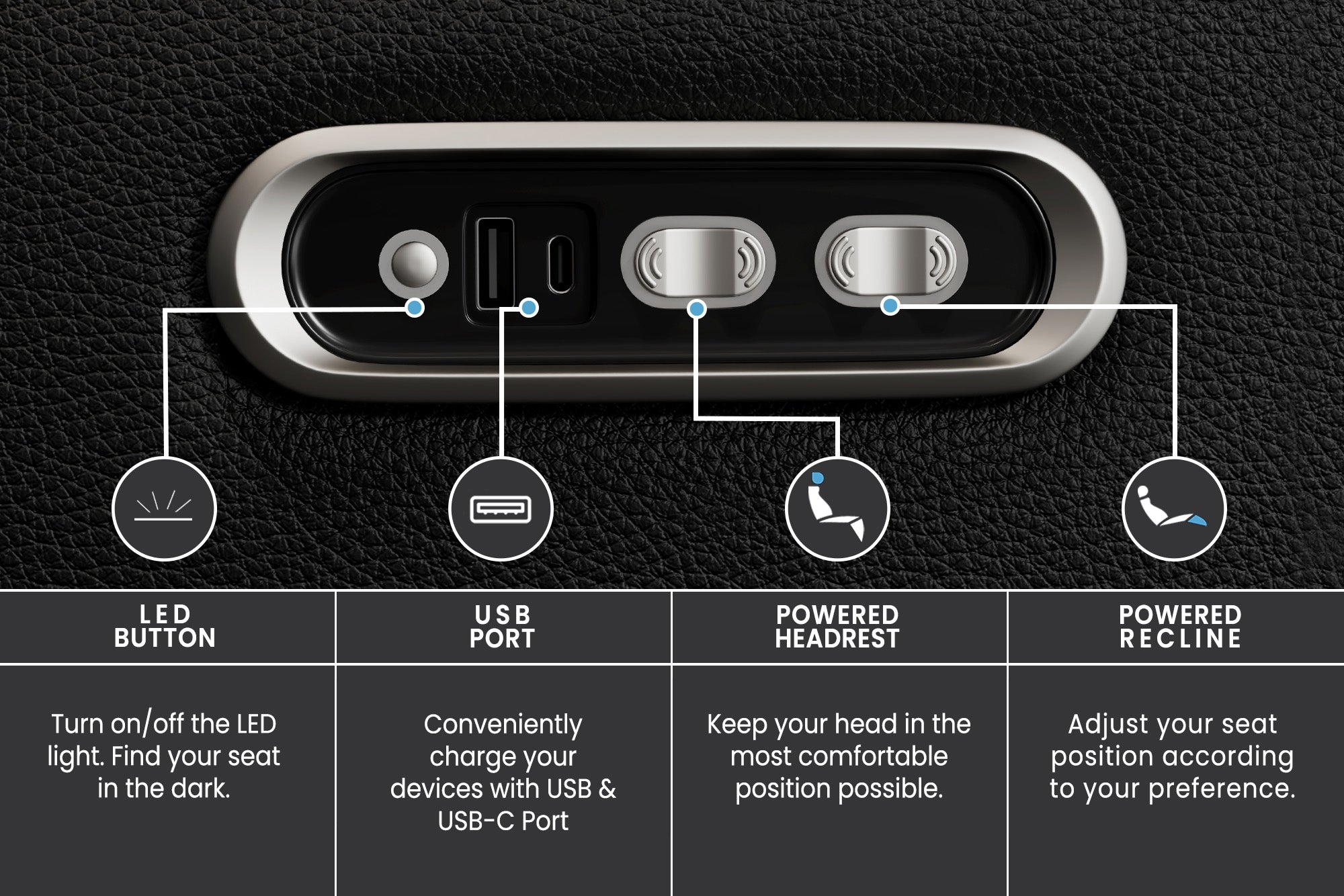 FeaturesLED Cup Holder, Power Headrest, Power Recliner, Storage Compartment