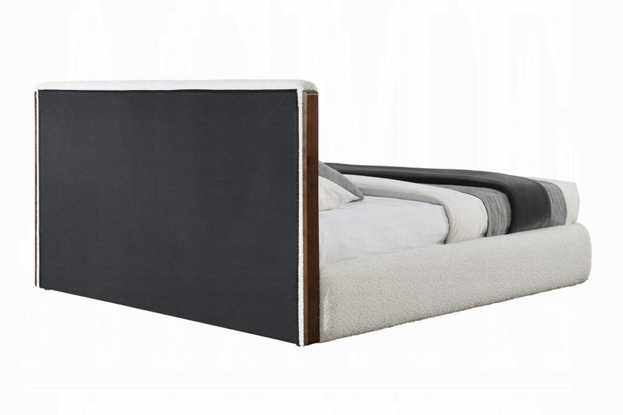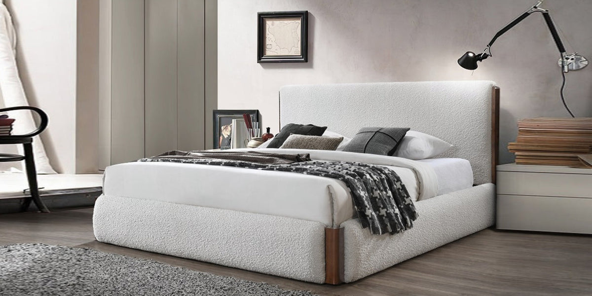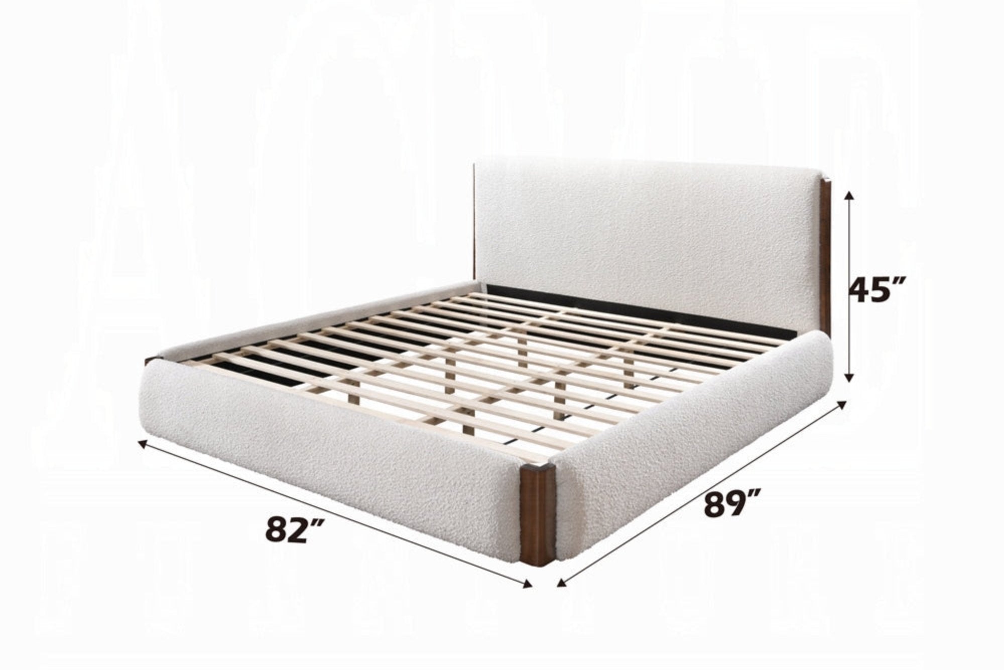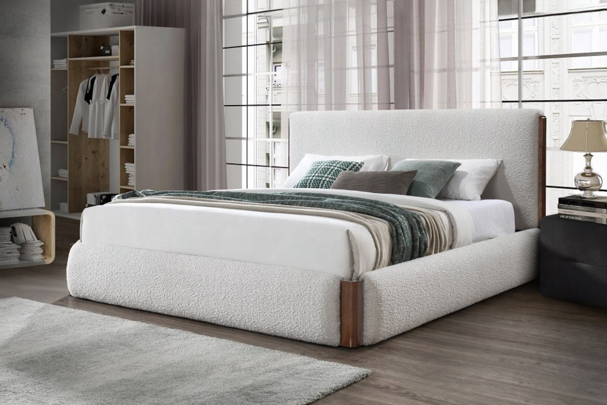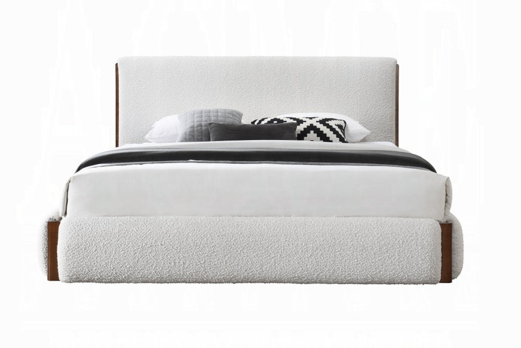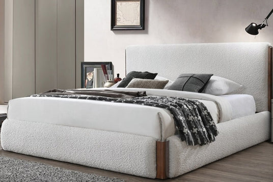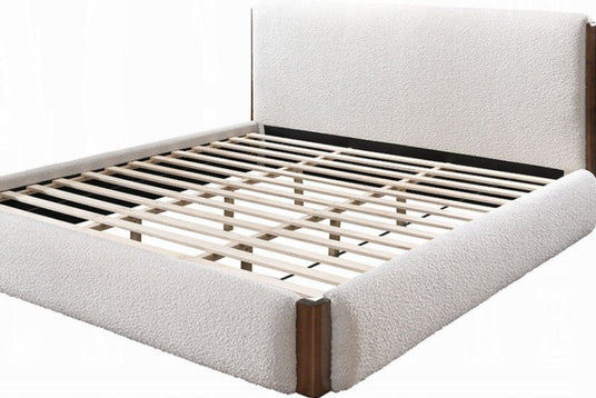 The Reggie bed's presence in the bedroom will never be missed with its unique, snuggly-looking cream boucle upholstery. It's walnut finish accent framing and textural cream material offer a look that’s equal parts modern and luxurious, with a soft, natural charm all its own. Throw on your favorite bed linens, put on your favorite pajamas, and let yourself be transported to blissful sleep.
