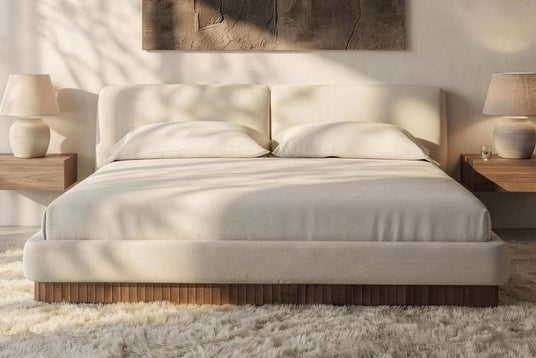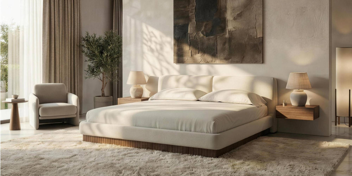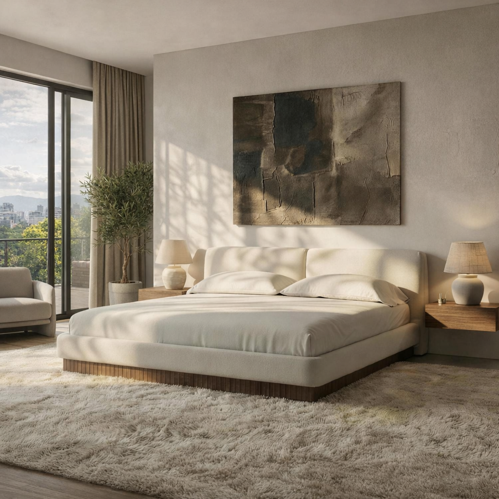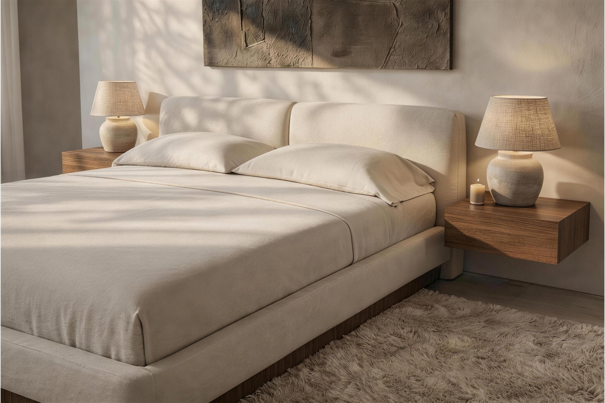 - Floating platform base creates a light, elevated look with clean architectural lines.