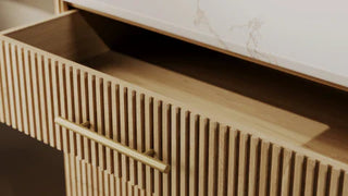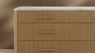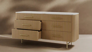 The Rowan Wood Dresser offers a sophisticated design that blends effortlessly into any bedroom. Expertly crafted from hand-finished white oak, the dresser is elevated by reeded oak detailing and luxurious white marble top, offering a modern yet timeless appeal. Its six spacious drawers glide effortlessly on under-mounted tracks, ensuring smooth operation, while reinforced mortise-and-tenon joinery guarantees long-lasting strength. The protective lacquer finish enhances the wood's natural sheen, perfectly paired with elegant zinc alloy hardware. Adjustable levelers provide stability, even on uneven surfaces, for a durable and stylish addition to your space.
