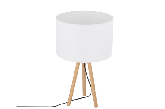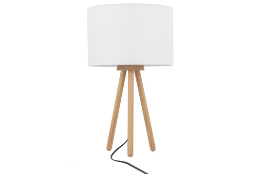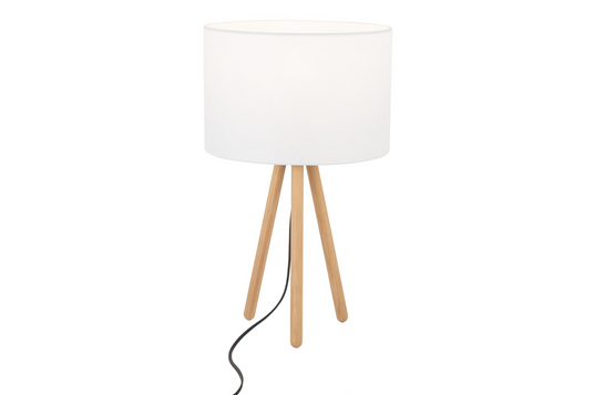 - Scandinavian-inspired table/night lamp featuring a classic rounded white fabric shade paired with a light wood tripod base, bringing elegant simplicity and organic warmth to any space.