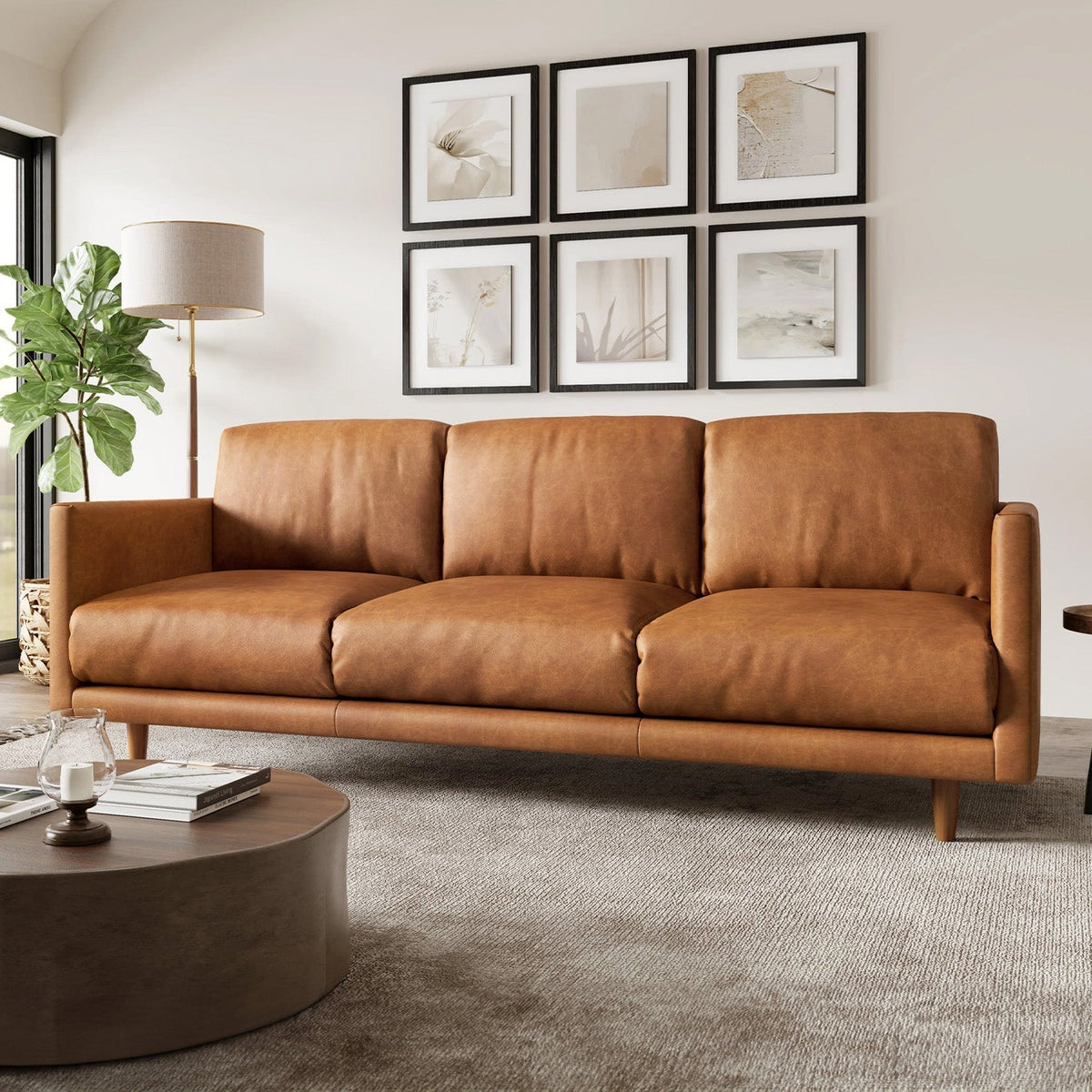 Introducing the Toulon leather sofa — where timeless style meets perfect comfort. Crafted with a durable corner-blocked wooden frame, the Toulon leather sofa is designed to stand the test of time. Made with the finest Italian top-grain leather, the leather upholstery is buffed for a soft touch and finished a timeless cognac color. The Toulon Sofa is a testament to uncompromising quality. The seat cushions feature a high-resiliency foam core wrapped in a fiber-down blend, and offer unmatched ergonomic comfort, while the fiber-down blend back cushions ensure optimal support.