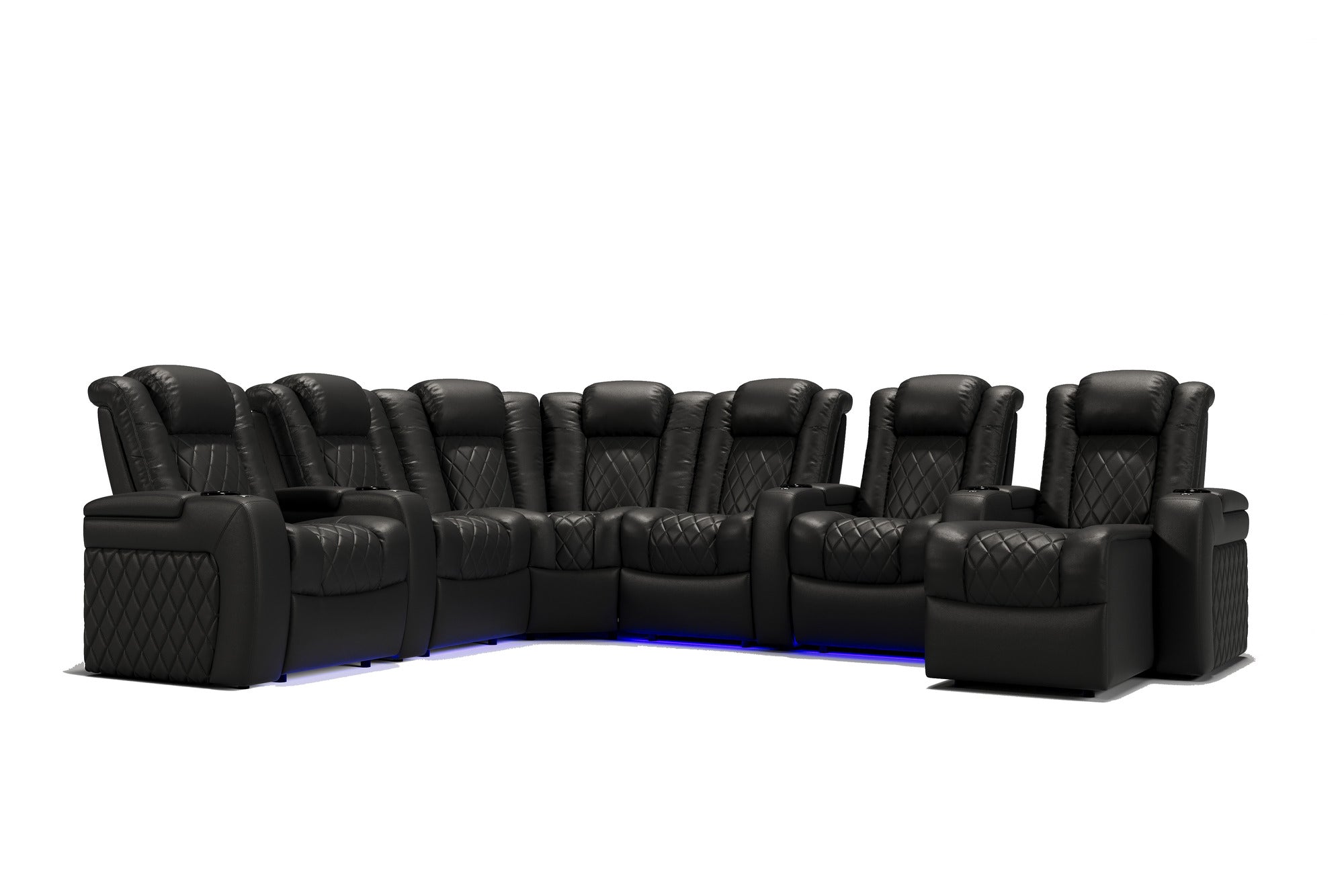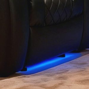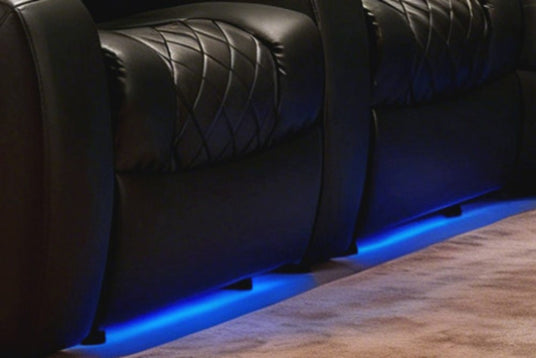 - Integrated LED lighting along the chair base and around the cup holders enhances the ambiance with a premium theater-style aesthetic.