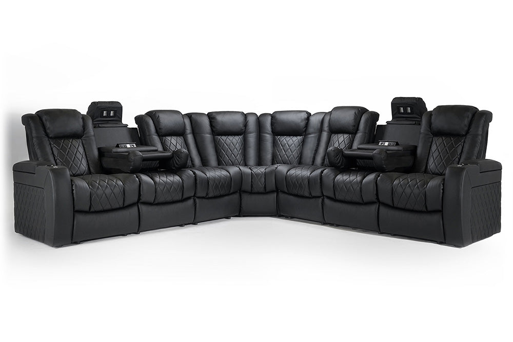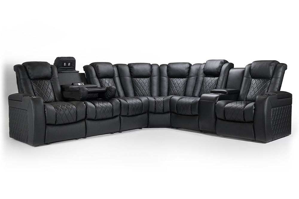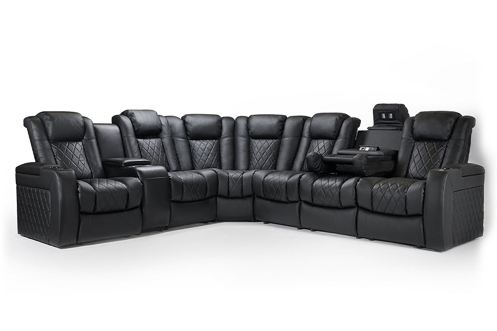 What makes movie night a luxurious experience? Is it the wine, the cozy atmosphere, or the supple feeling of leather as it supports your back as you recline your chair to better enjoy the movie experience? Reclining sectionals with powered lumbar support built for home theaters like The Tuscany Multimedia Sectional can provide you a luxurious experience that will take movie night to the next level of comfort. Get ready to sink into movie night with our top-of-the-line entertainment room sectional sofa. With ample seating, the sectional will be the center of attention for all your guests and friends!