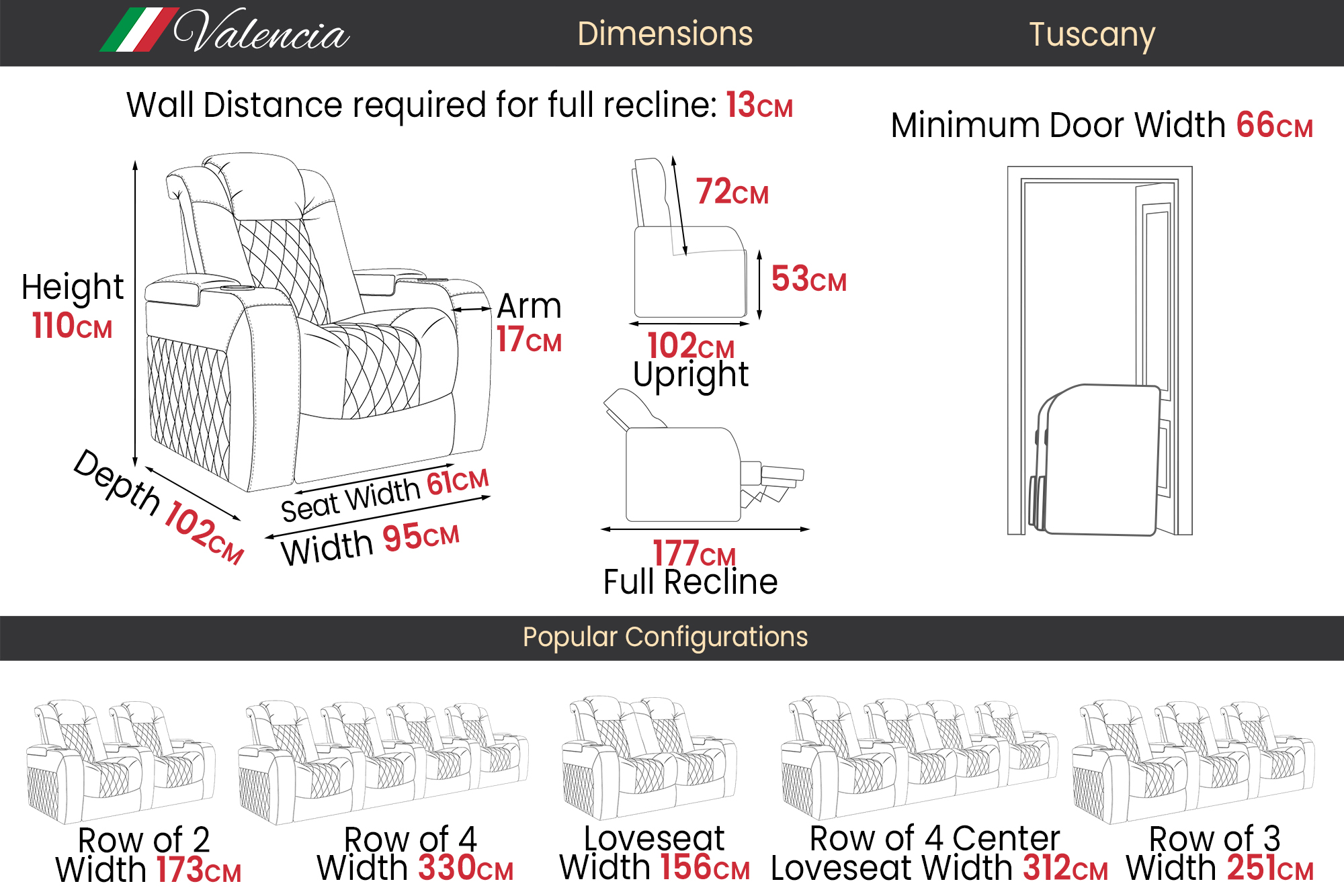 A unique combination of style, comfort, and luxury, the Tuscany makes it possible to get the most out of your movie nights with friends and family. With LED cup-holders, ambient base lighting, premium Italian top grain Nappa leather 11000 on all seating surfaces, and motorized recliner mechanisms, the Tuscany allows you to experience your home theater the way you have never experienced it before.
