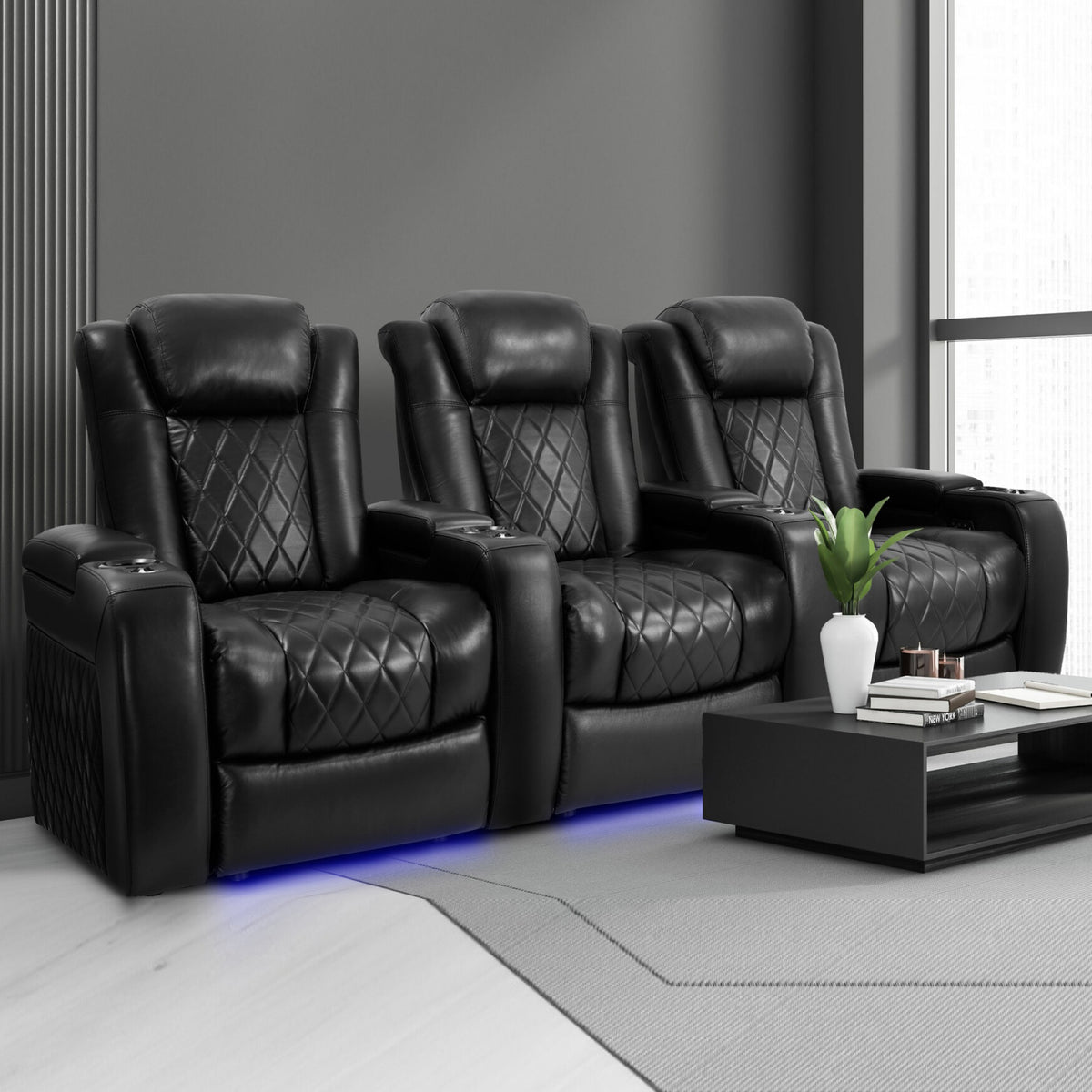 - Features power-adjustable lumbar support, headrest, and recline for personalized relaxation.