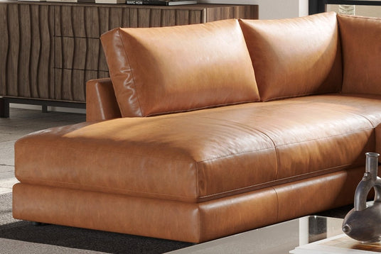 Indulge in luxury and sophistication with our Italian Nappa 11000 top-grain leather sofa, impeccably upholstered for elegance and style, elevating any space with its premium allure. Designed for ultimate relaxation, its low-slung silhouette beckons you to sink into the sumptuously padded seat, embraced by plush, padded arms for added coziness. Stretch out and unwind on the chaise, tailored for leisure and relaxation, offering ample space to sprawl and luxuriate in comfort. Crafted with precision, the specially treated leather withstands pet scratches, ensuring durability without compromising style. Experience unmatched comfort and style with our meticulously designed leather sofa, enhancing your lounging experience and elevating your home decor to new levels of luxury.