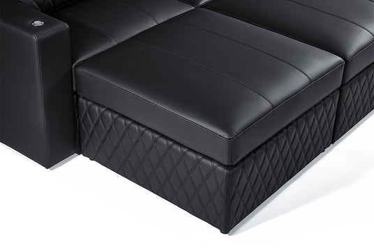 Prepare to indulge in the journey of luxurious comfort and exquisite design. Introducing the Valencia Pisa Top Grain Nappa 11000 Leather Sectional Sofa – a masterpiece that will captivate your heart and elevate your living space to unparalleled levels of sophistication. Crafted with utmost care and precision, this magnificent sectional sofa is adorned in luscious black Top Grain Nappa 11000 Leather, effortlessly exuding an air of timeless elegance. Experience ultimate comfort and versatility with our U-shaped theater seating featuring a bonus ottoman, allowing you to relax and stretch out in style.
