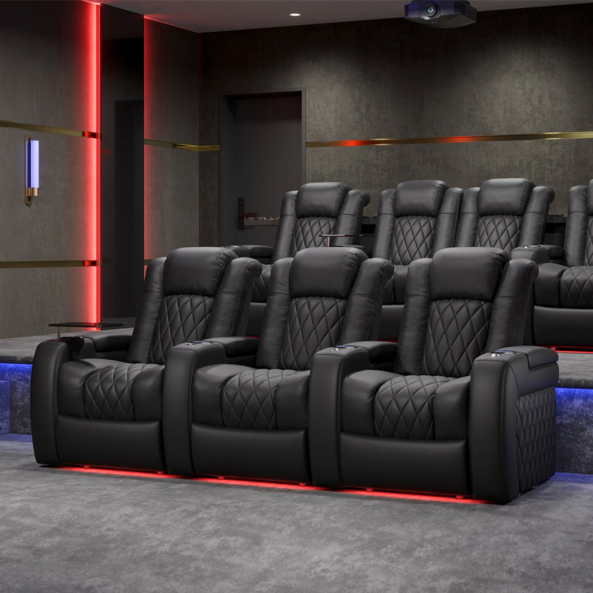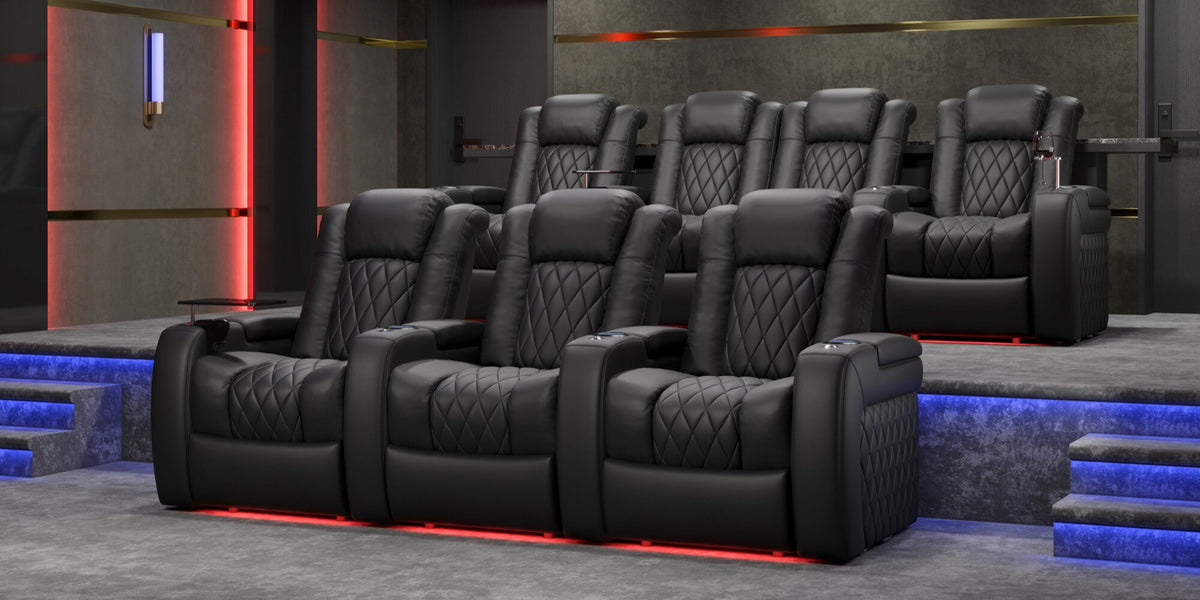 Introducing the 2025 Version of Our Best-Selling Tuscany Home Theater Seating! Upgrade your home theater with the brand new Tuscany 2025 with upgraded technology and cutting-edge comfort, A perfect blend of luxury, style, and comfort. Designed for unmatched relaxation, this premium recliner is crafted with new imported Italian Nappa 11,000 Top Grain Leather on all seating surfaces, offering a smooth and elegant touch. Enjoy immersive movie nights with new RGB cup holders with ambient base lighting, and a motorized reclining system that lets you find your perfect seating position effortlessly. The newly upgraded Tuscany now features deeper hidden arm storage, perfect for keeping your accessories close at hand. Plus, an air piston-assisted storage lid ensures smooth and safe operation. Our tactile button control system replaces traditional soft-touch buttons, allowing you to activate all functions simultaneously for an enhanced experience.