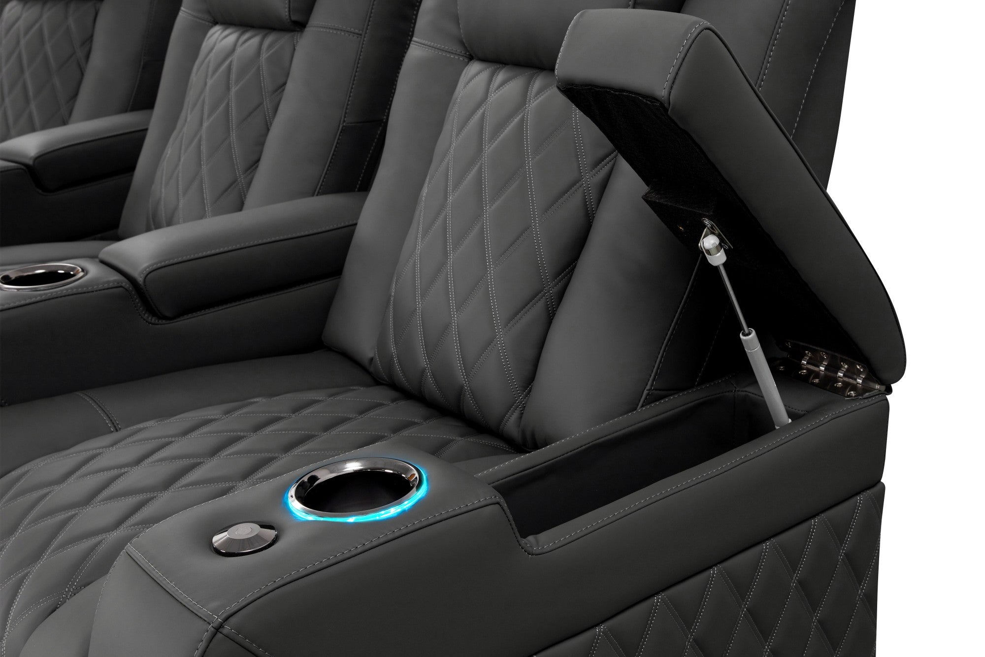 Combining design and function, the Tuscany Console provides luxury through its supple leather, cozy cushions, supportive headrest and a center console that holds your favorite glass of wine and food platter—the essential entertainment room seating accessories for a great time. Both the left and right end seats are full power recliners with power lumbar and headrest adjustability. Customization is possible, so tailor as you see fit and enjoy the ultimate home theater experience in an entertainment room seat that is the epitome of comfort with the Tuscany Console.
