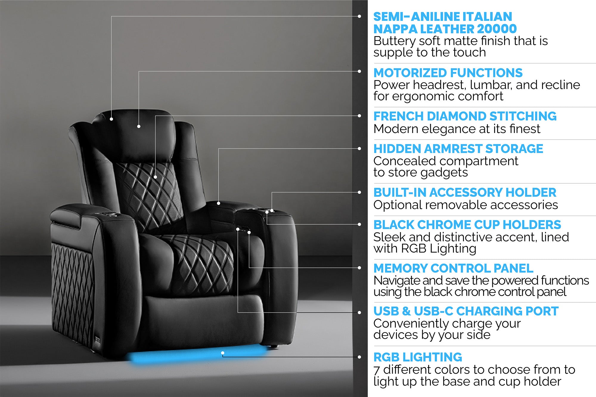 Introducing the 2025 Version of Tuscany Luxury Edition Home Theater Seating! Newly upgraded Tuscany Luxury Edition is a luxurious upgrade from our Tuscany model. It is the perfect seat for those seeking bespoke craftsmanship with a timeless design. Located on all parts of the chair that touch your body, the luxury Semi-Aniline Italian Nappa leather 20000 is a step above our premium top grain Nappa leather 11000. The smooth buttery matte finish is unwavering in its perfection and luxe appeal.